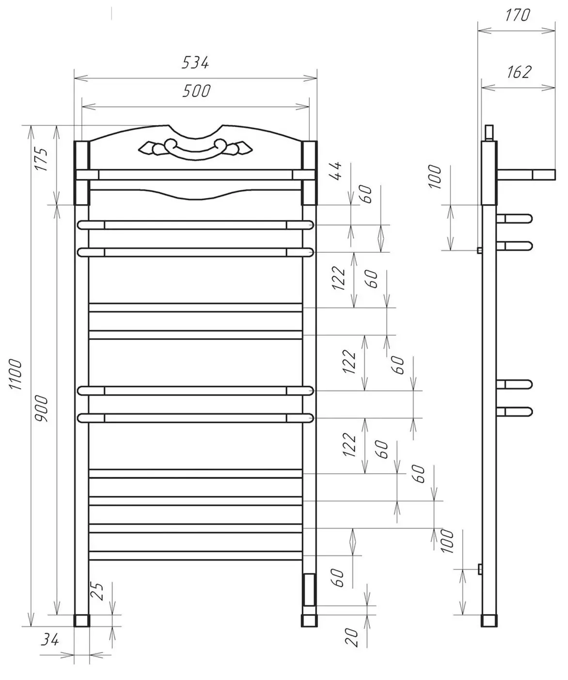 - Размер полотенцесушителя 53,4х110 см