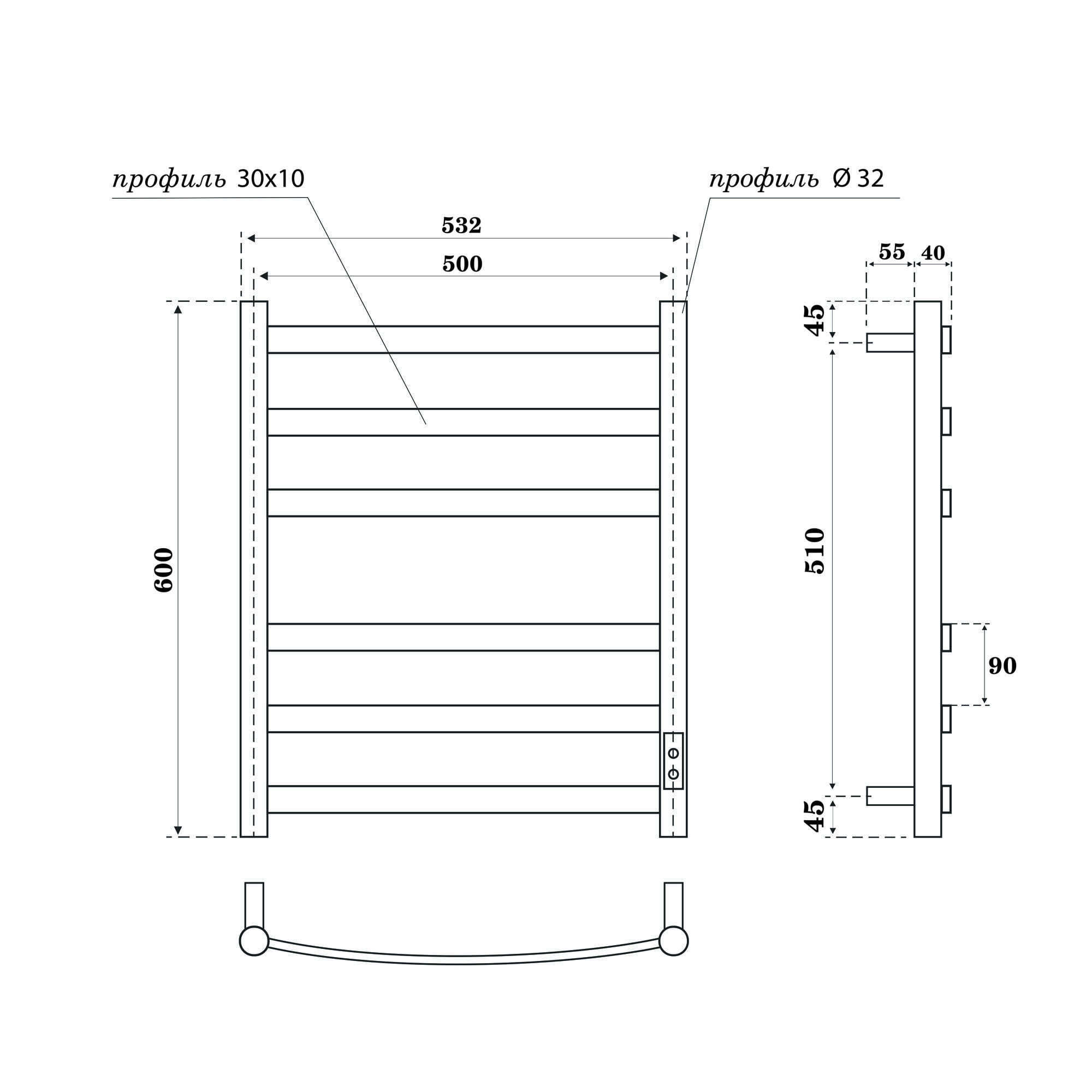 - Размер полотенцесушителя 53,2х60 см