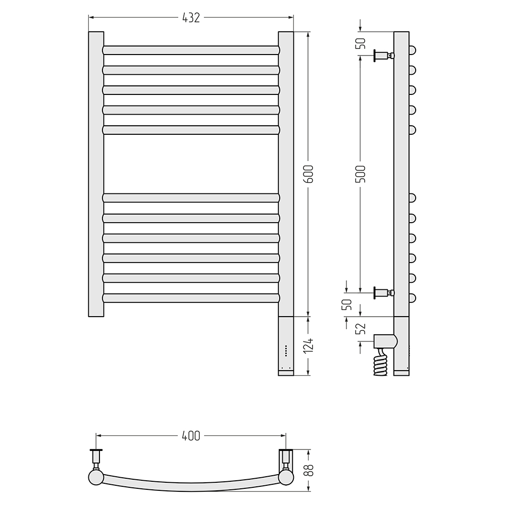 Оснащение : полотенцесушитель, блок управления, кабель, скрытое подключение ( интегрировано в корпус), телескопические кронштейны, шестигранный ключ, дюбели и саморезы