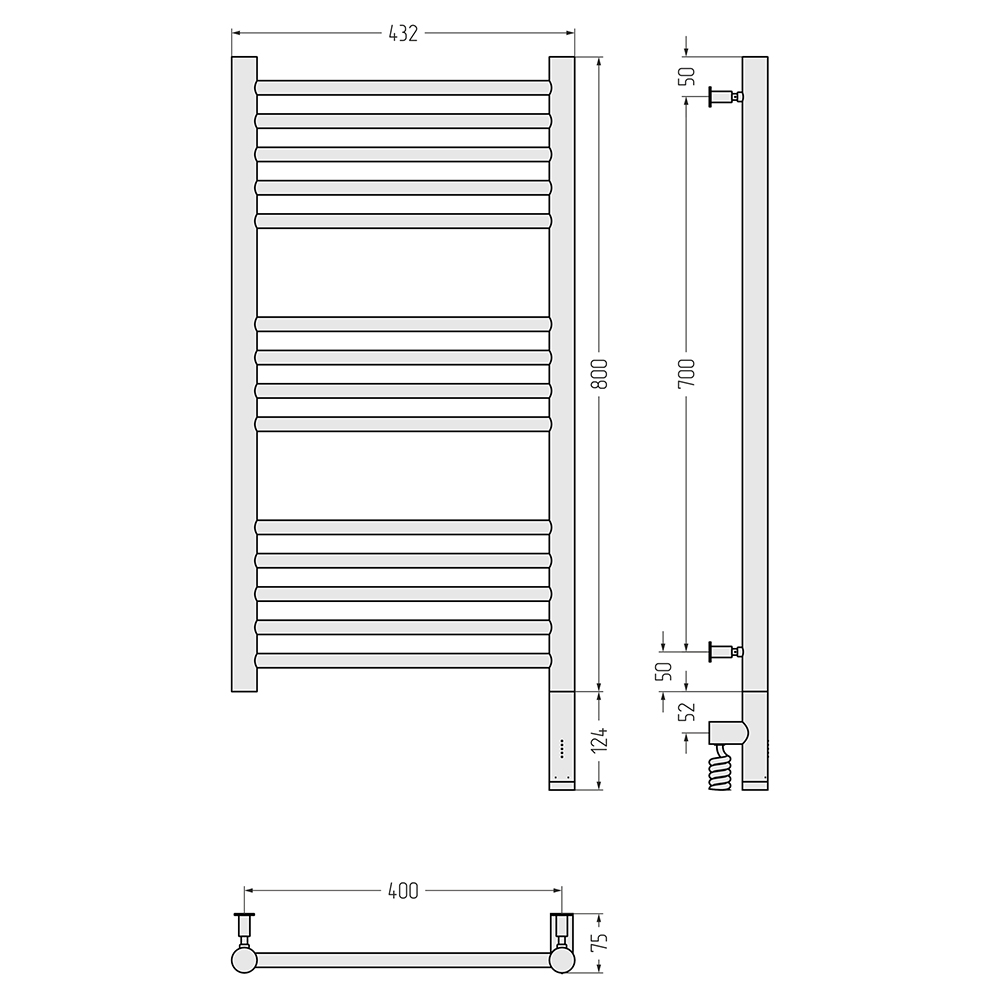 Оснащение : Полотенцесушитель, блок управления с кабелем, интегрированное в корпус скрытое подключение, телескопические кронштейны, шестигранный ключ, дюбели и саморезы