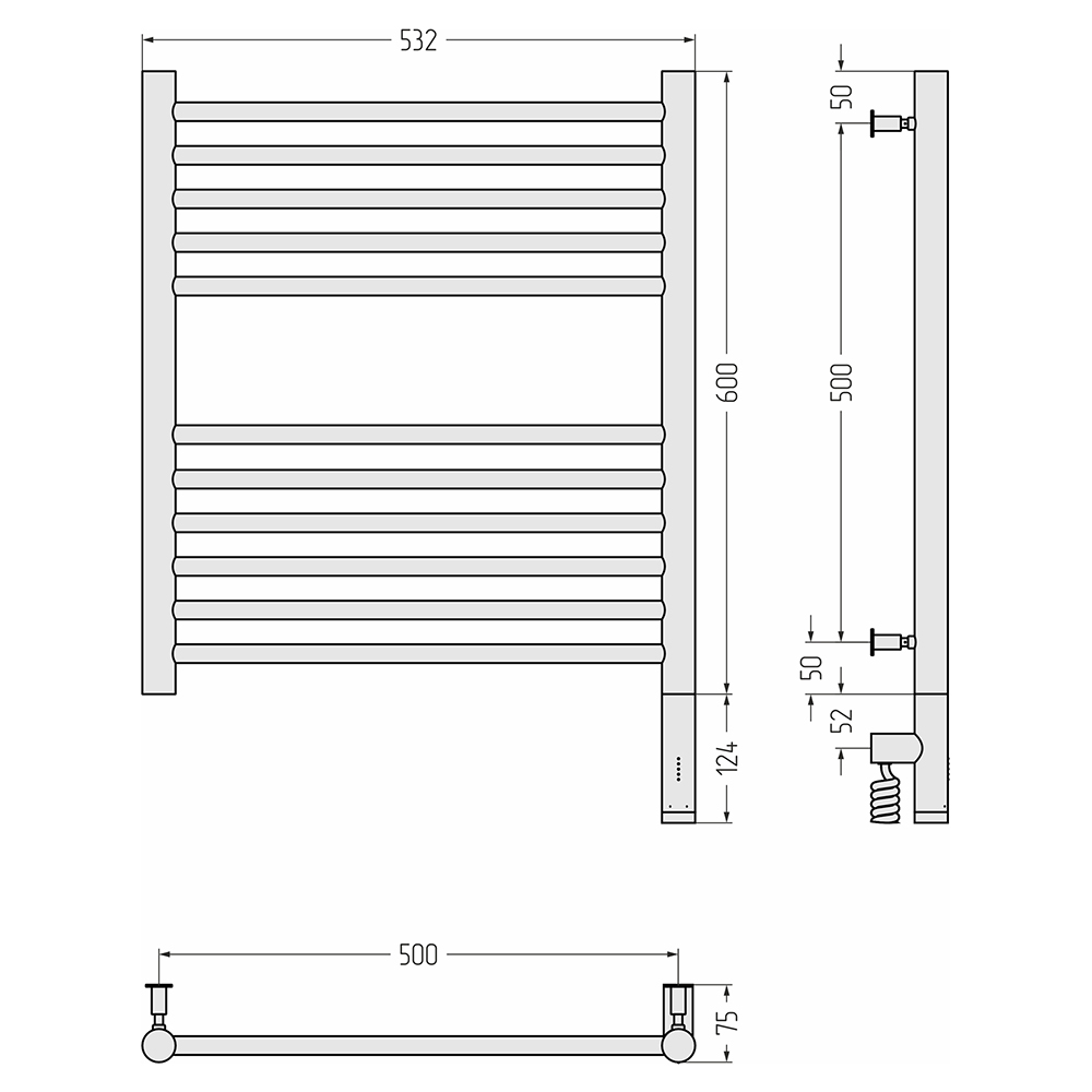 Оснащение : Полотенцесушитель, блок управления с кабелем, интегрированное в корпус скрытое подключение, телескопические кронштейны, шестигранный ключ, дюбели и саморезы