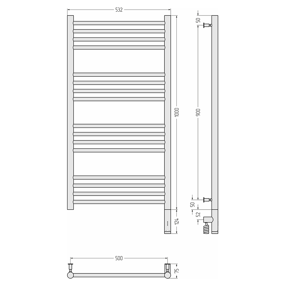 Оснащение : Полотенцесушитель, блок управления с кабелем, интегрированное в корпус скрытое подключение, телескопические кронштейны, шестигранный ключ, дюбели и саморезы