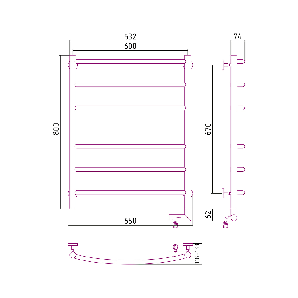 Оснащение : Полотенцесушитель, блок управления с кабелем, телескопические кронштейны, шестигранный ключ, дюбели и саморезы. Приобретается отдельно: модуль скрытого подключения для мэм d 28 мм