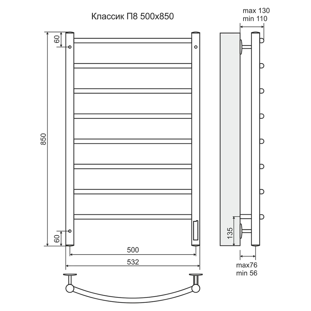 - Размер полотенцесушителя 53,2х85 см