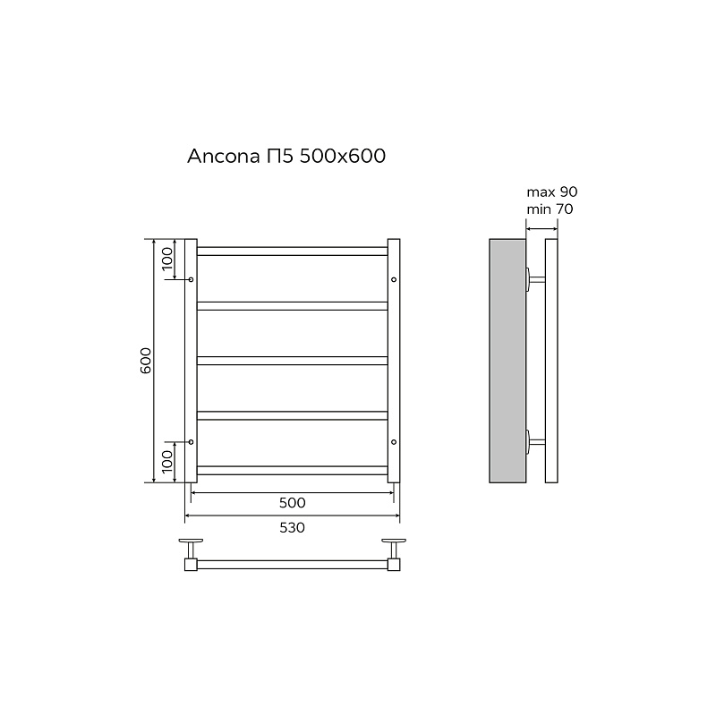 • Высота 600 мм и ширина 500 мм делают эту модель универсальной для большинства ванных комнат. Она обеспечивает достаточное пространство для сушки полотенец, не занимая при этом много места.