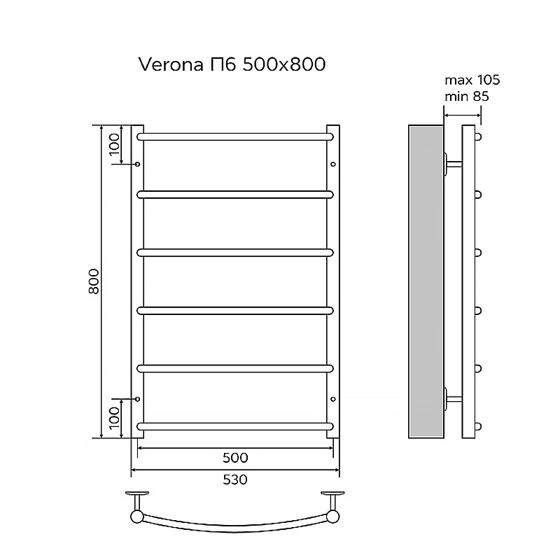 • Высота 800 мм и ширина 500 мм делают этот полотенцесушитель универсальным решением для большинства ванных комнат, обеспечивая достаточное пространство для сушки полотенец.