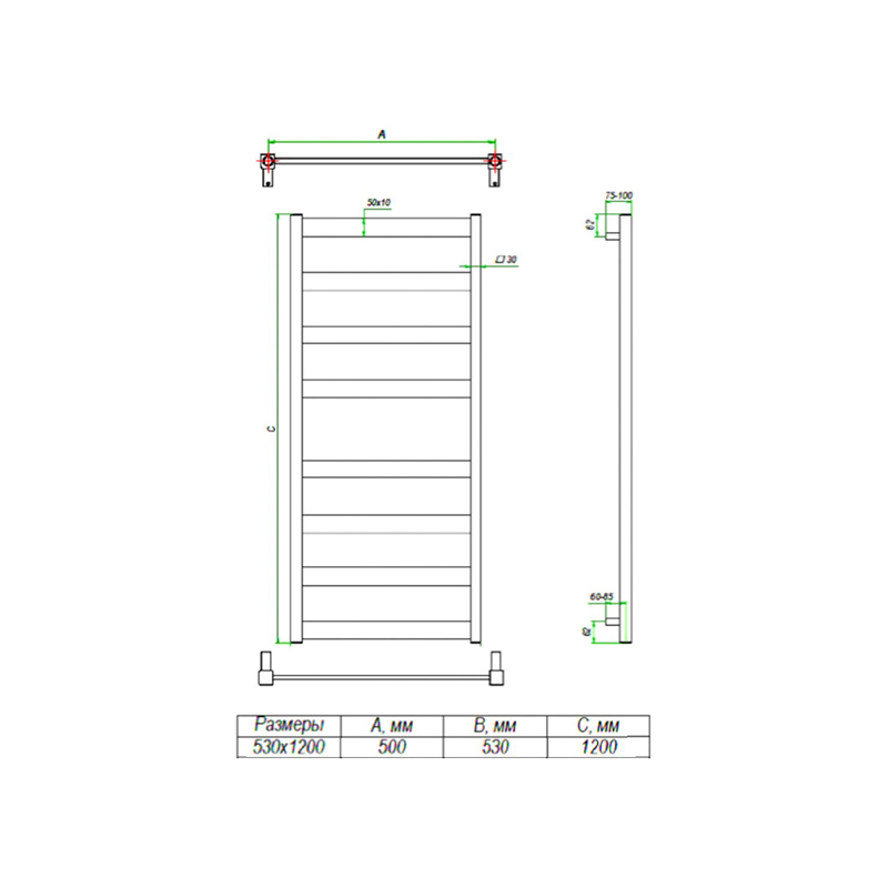 - Размер полотенцесушителя 53х120 см