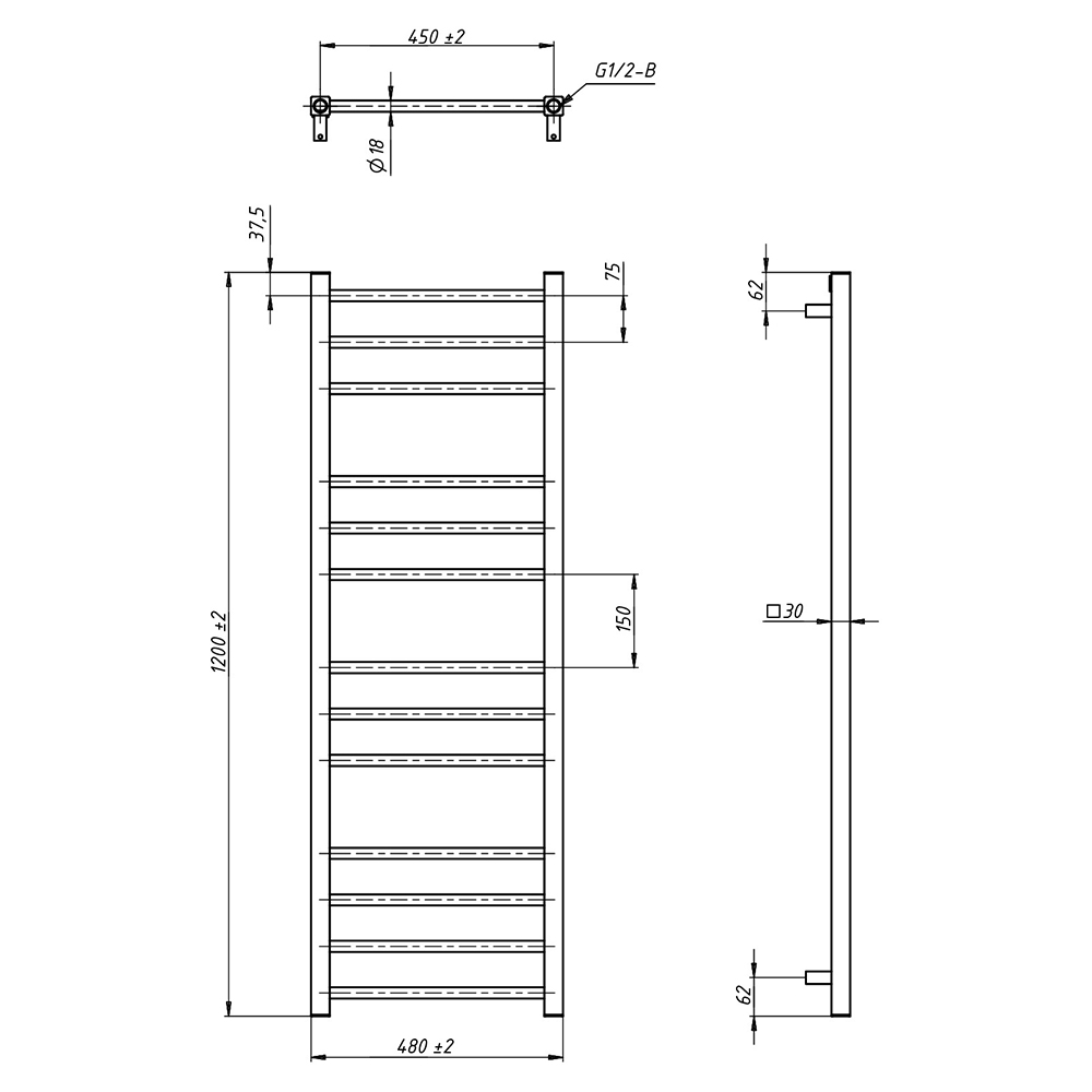 - Размер полотенцесушителя 48х120 см