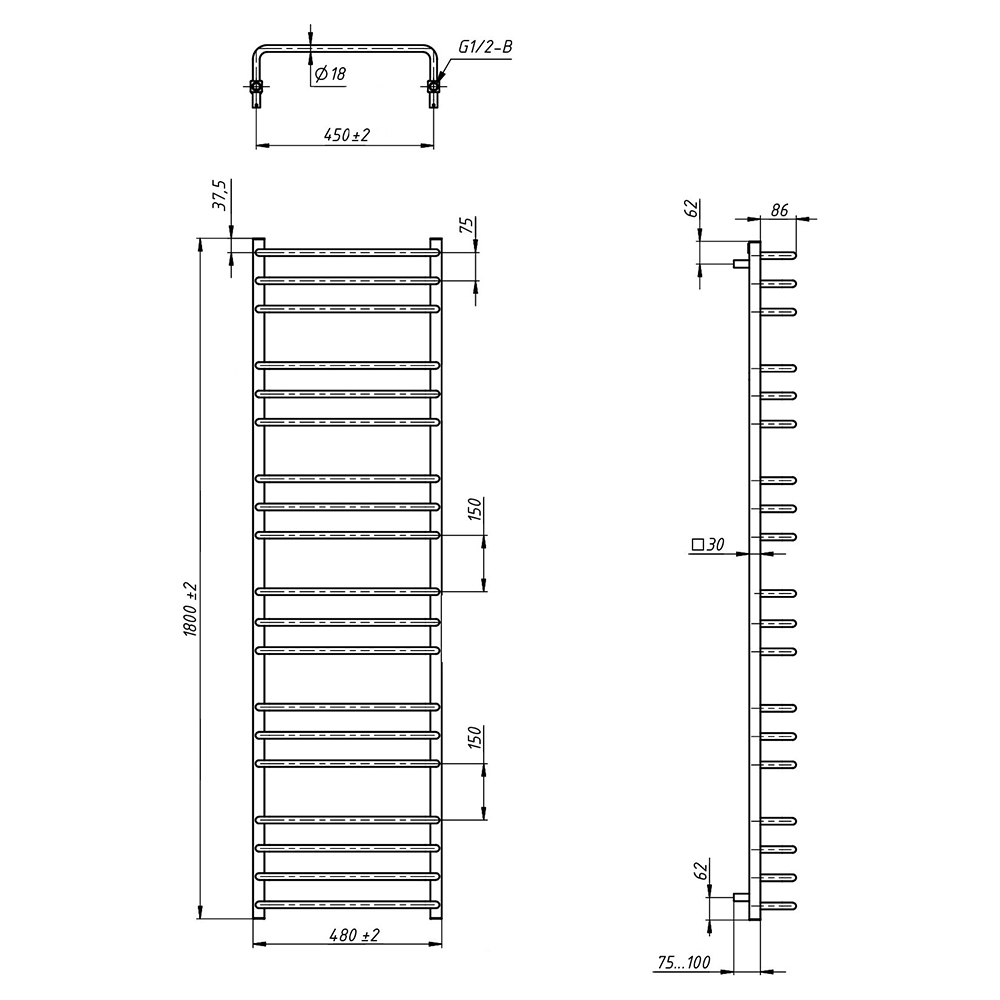- Размер полотенцесушителя 48х180 см