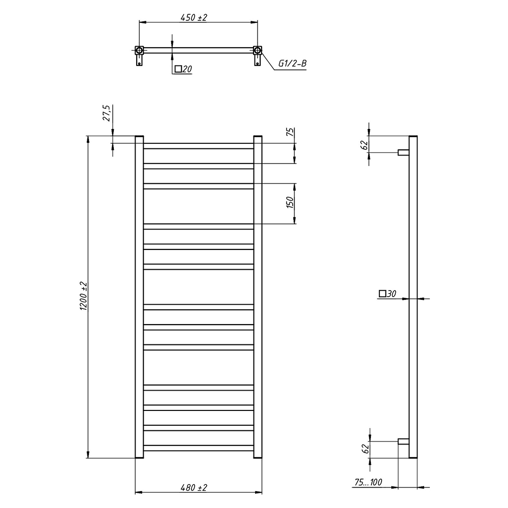 - Размер полотенцесушителя 48х120 см