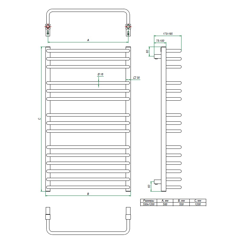 - Размер полотенцесушителя 53х120 см