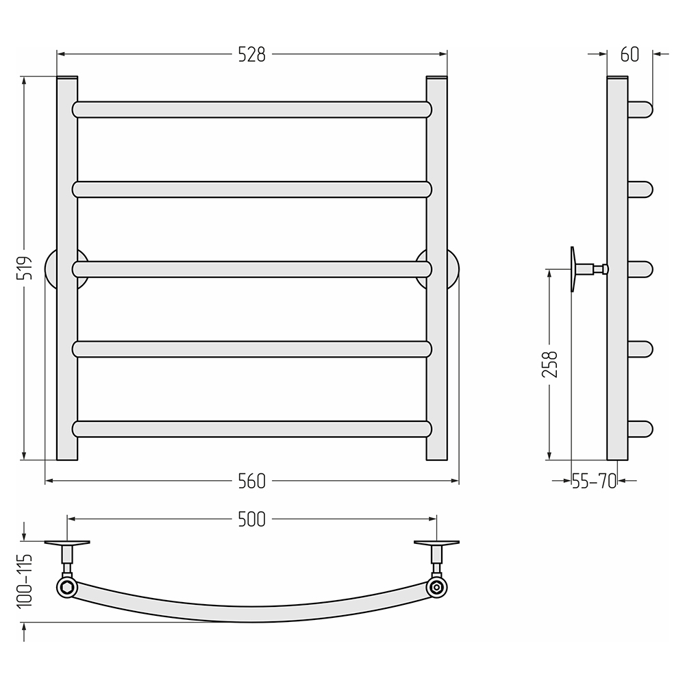 Оснащение : Полотенцесушитель, кронштейн телескопический, спускной клапан, заглушка. для подключения потребуется: два соединительных элемента угловых/прямых.