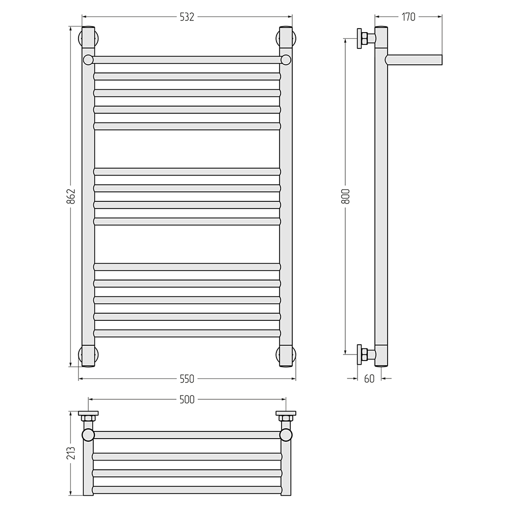 Оснащение : Полотенцесушитель, угловые элементы, спускной клапан, отражатели, эксцентрики и опоры кронштейнов, декоративные заглушки, комплект прокладок, шестигранные ключи, дюбели и саморезы