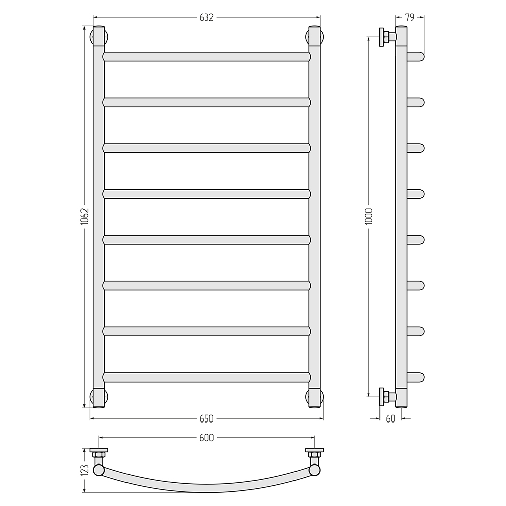 Оснащение : Полотенцесушитель, угловые элементы, спускной клапан, отражатели, эксцентрики и опоры кронштейнов, декоративные заглушки, комплект прокладок, шестигранные ключи, дюбели и саморезы