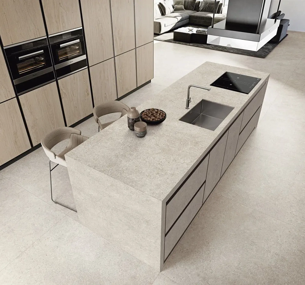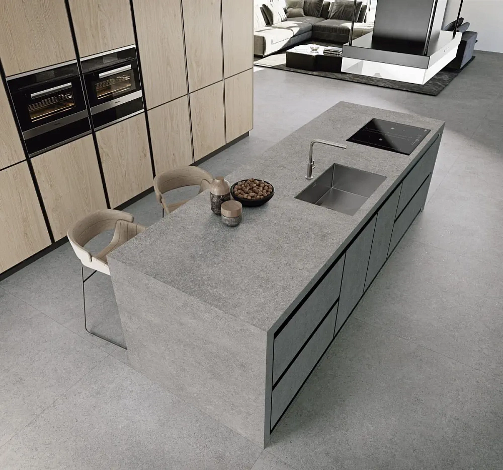 Поставляется в формате 1000x3000 мм и четырех натуральных цветах - песочный, серо-коричневый, графитовый и коричневый - с толщиной 10,5 мм специально для кухонных столешниц. Кроме того, для создания пространств с эстетической непрерывностью серия доступна в фарфоре толщиной 5,6 мм и форматами 1200x1200 и 1200x600 мм.