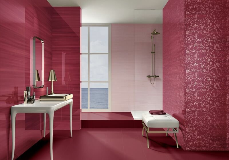 Сочность вишневого оттенка и нежного розового идеально сочетаются друг с другом, а дополнение шоколадным и кремовым цветами поможет все красиво обыграть. Интересный рельеф плитки разноображен такими вариантами, как теневой рисунок, мозаика из плитки, а также сочетание двух основных цветов коллекции в одной плитке. Цветочный декор выполнен в трех цветовых решениях: розовом, вишневом и бежевом. Мозаика же разбавлена коричневым. Вариантов оформления с такой настенной плиткой огромное множество, а для придания некоторых акцентов можно использовать бордюр.