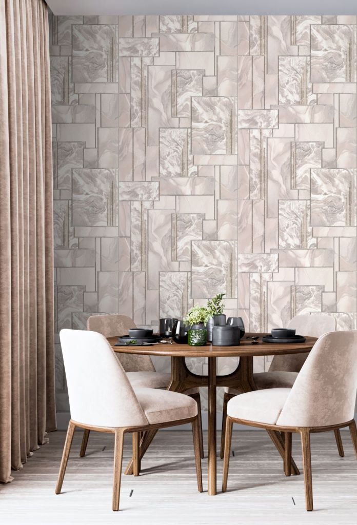 Рисунок, вдохновленный благородством мрамора и металлизированным блеском линий, напоминает дизайнерский калейдоскоп плиток. Мотив можно клеить без подгона — плитки идеально совпадают на стыках и после поклейки расход обоев будет минимален.