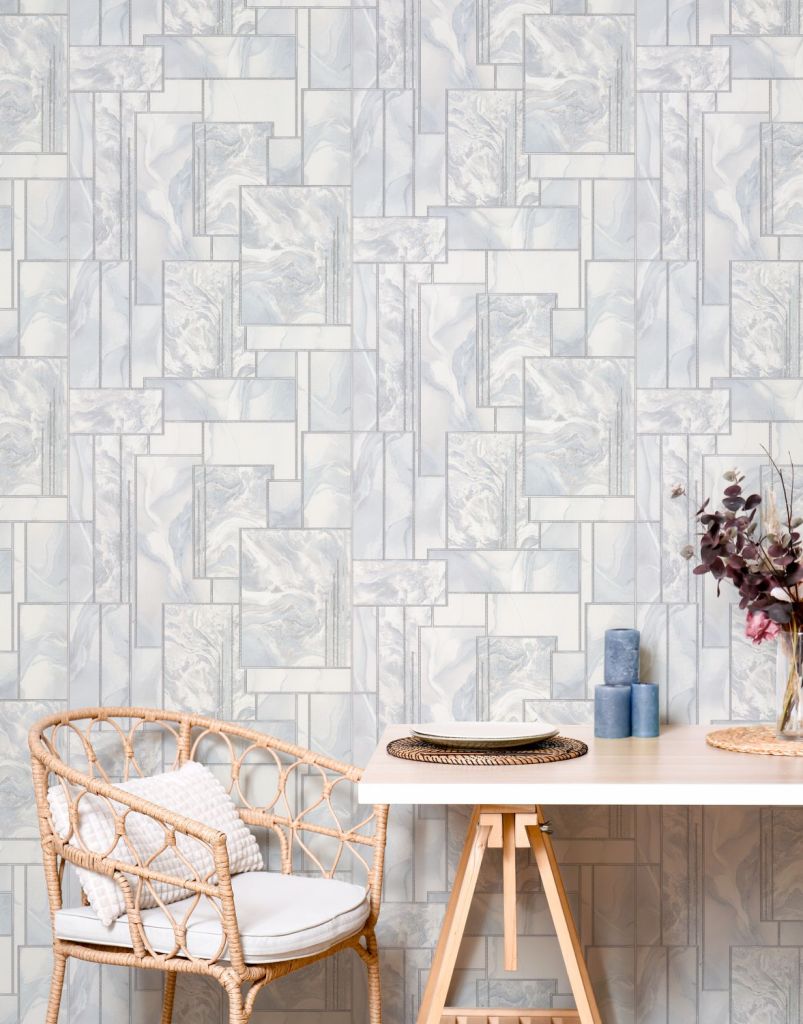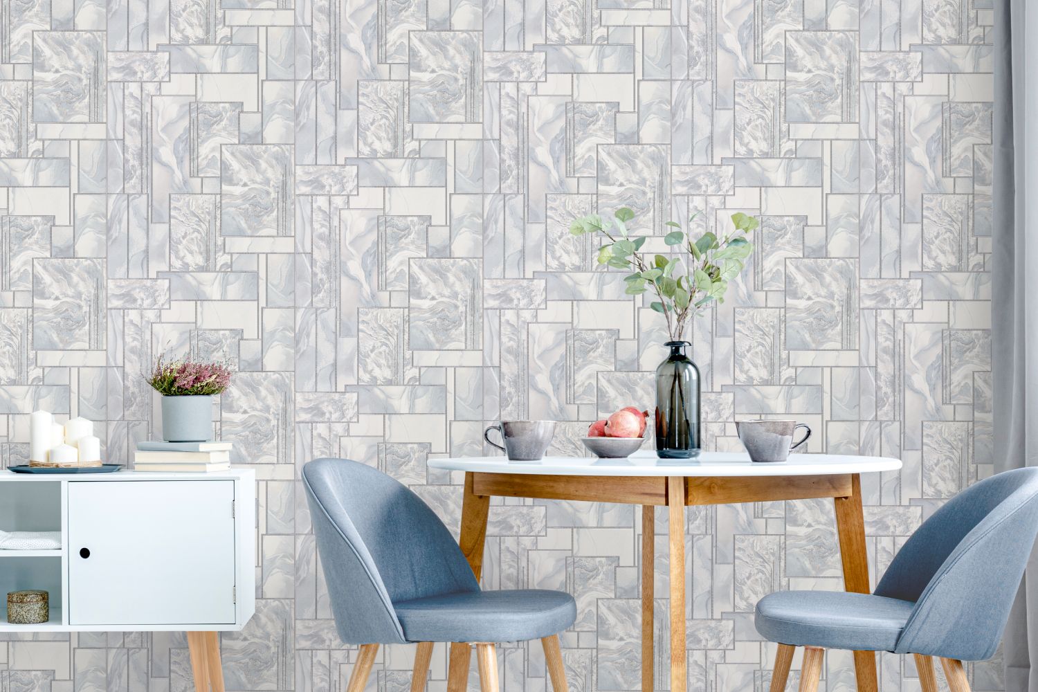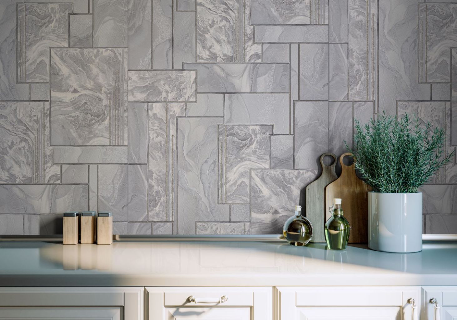 Рисунок, вдохновленный благородством мрамора и металлизированным блеском линий, напоминает дизайнерский калейдоскоп плиток. Мотив можно клеить без подгона — плитки идеально совпадают на стыках и после поклейки расход обоев будет минимален.