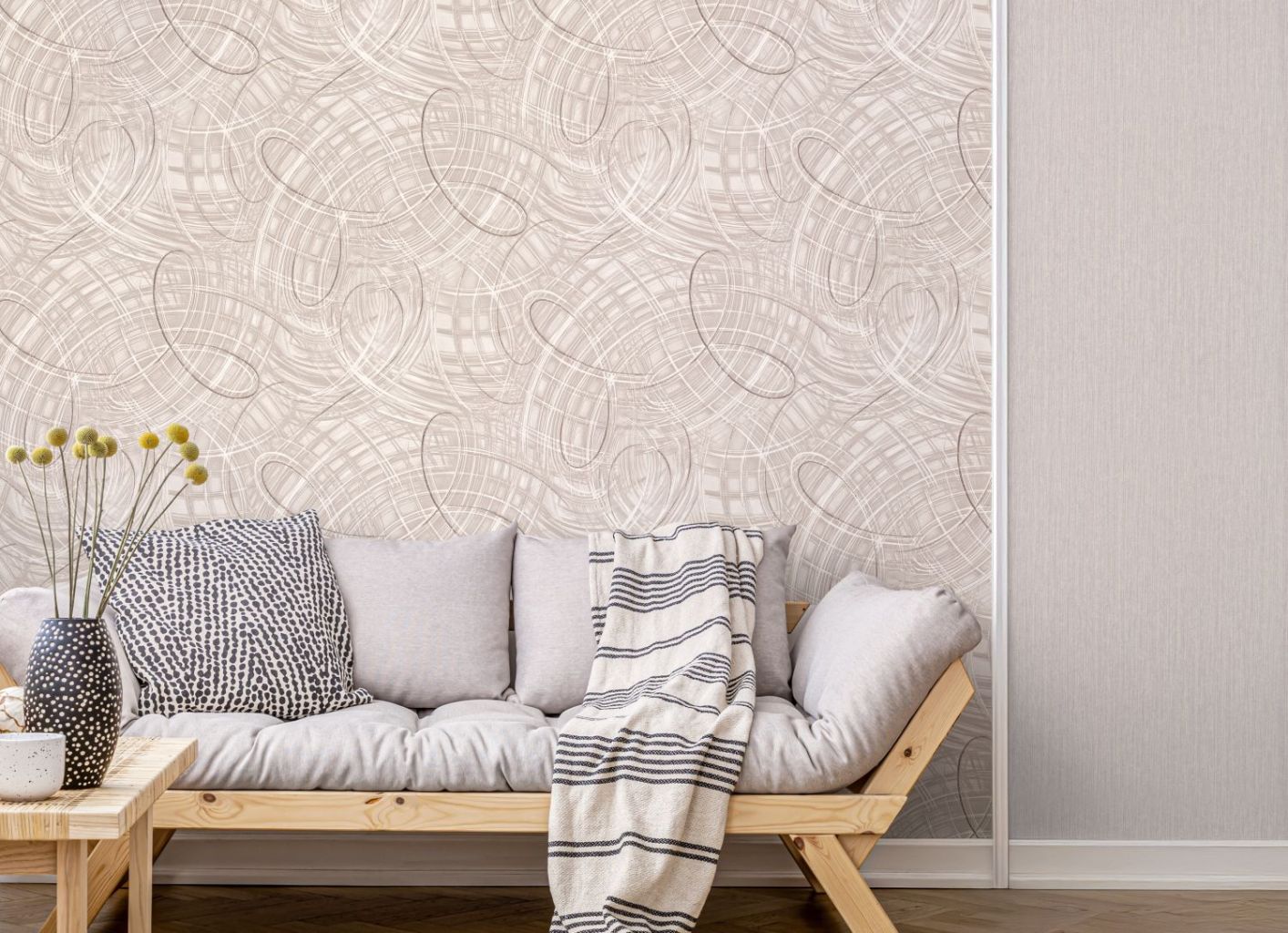 Структура фона имитирует натуральную ткань с плотным рельефом. Оригинальный, вертикально направленный рисунок аккуратно вытягивает интерьер, а приятный для покупателя подгон «0» – упрощает поклейку.