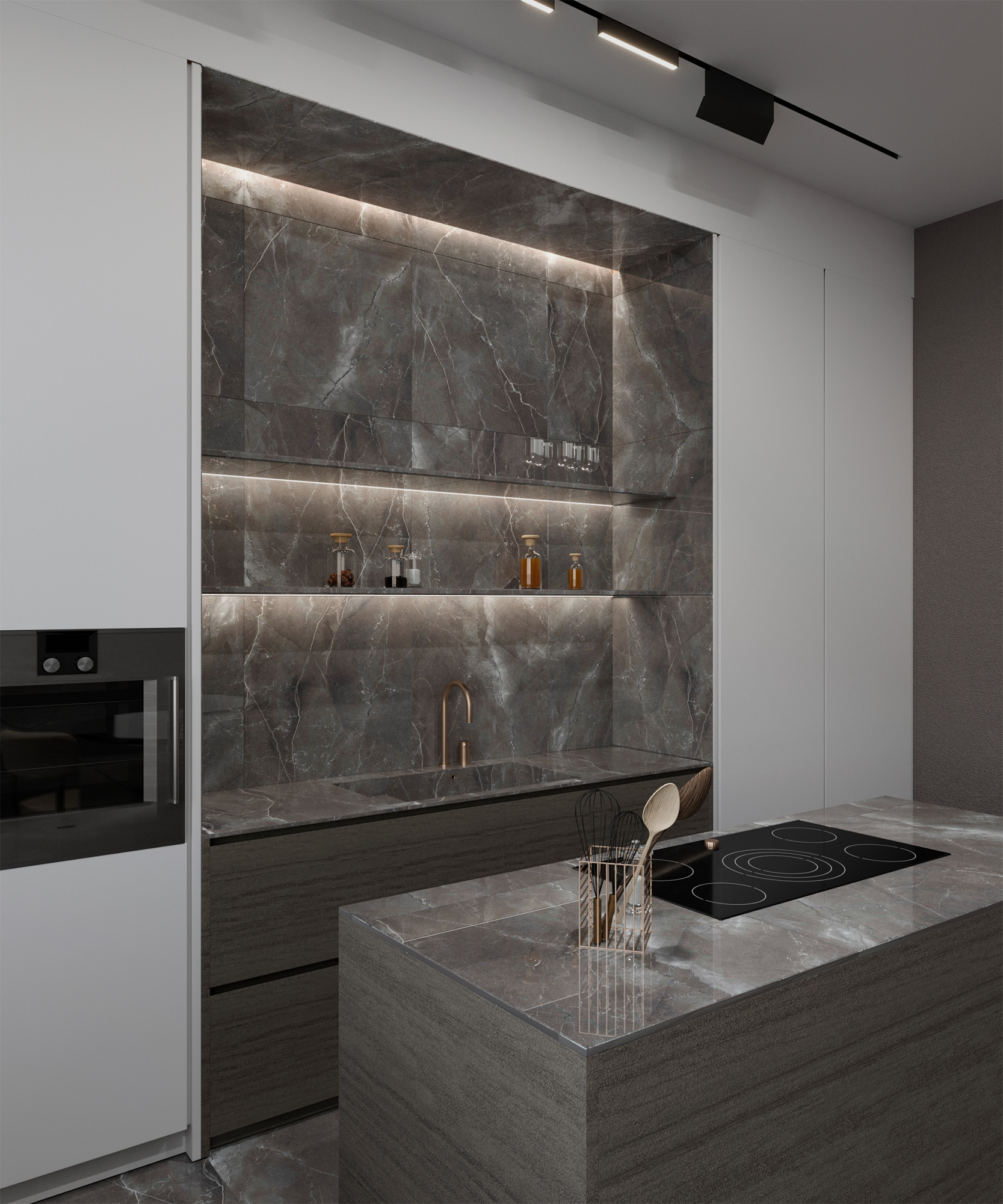 Полированная поверхность в сочетании с тёплым серым оттенком отражает свет и наполняет комнату сиянием, создавая уютную и комфортную атмосферу, визуально расширяя помещение.