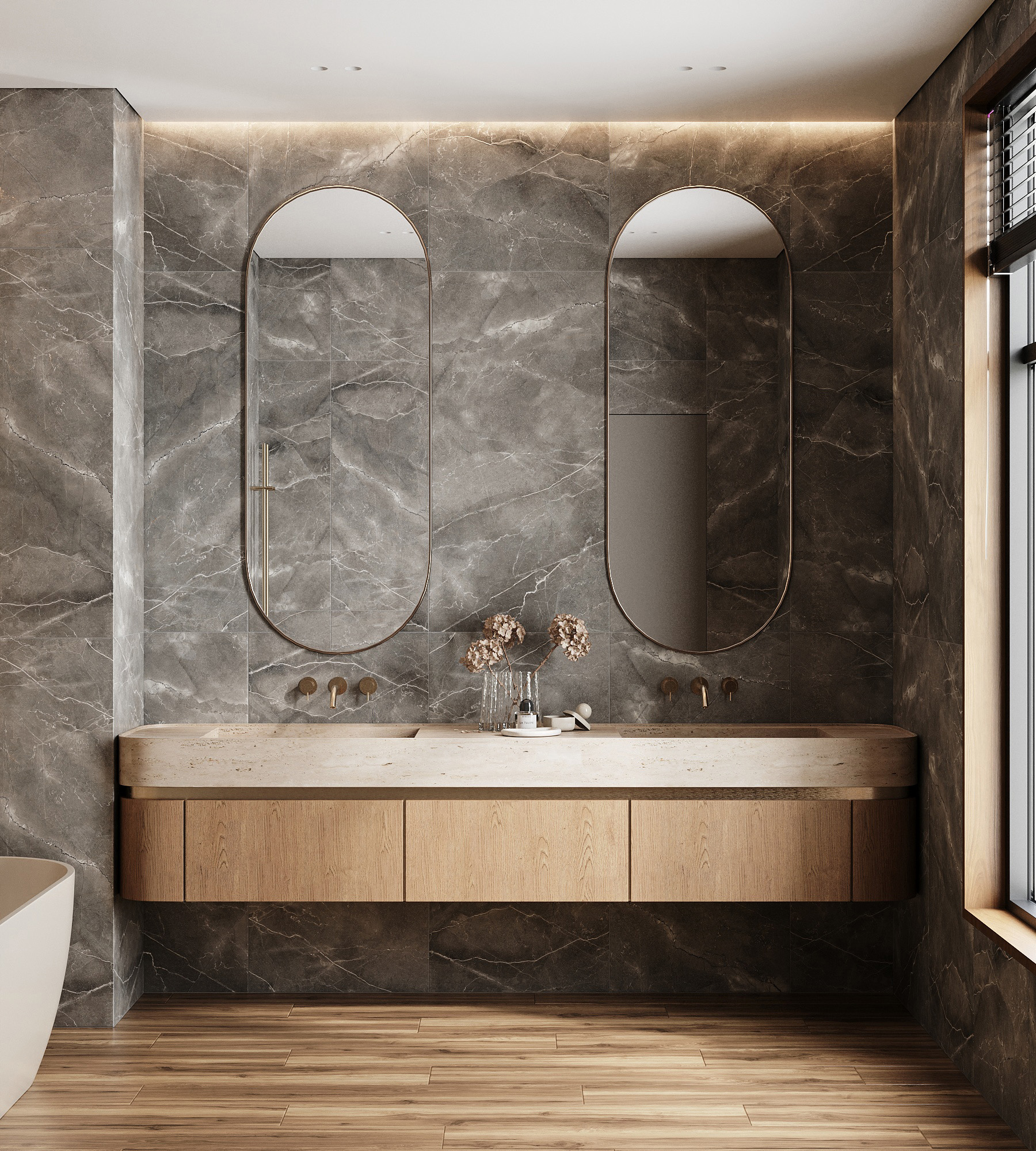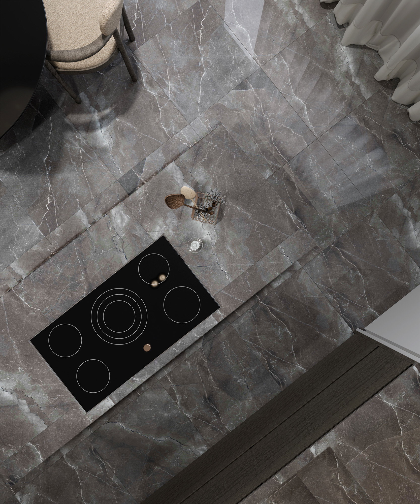 PULPIS NERO прекрасно взаимодействует с различными отделочными материалами. Дерево, металл, стекло – все это гармонично сочетается с его выразительной текстурой. Благодаря этому керамограниту ваш интерьер приобретет уникальный стиль и индивидуальность, а атмосфера будет наполняться теплотой и природной красотой.