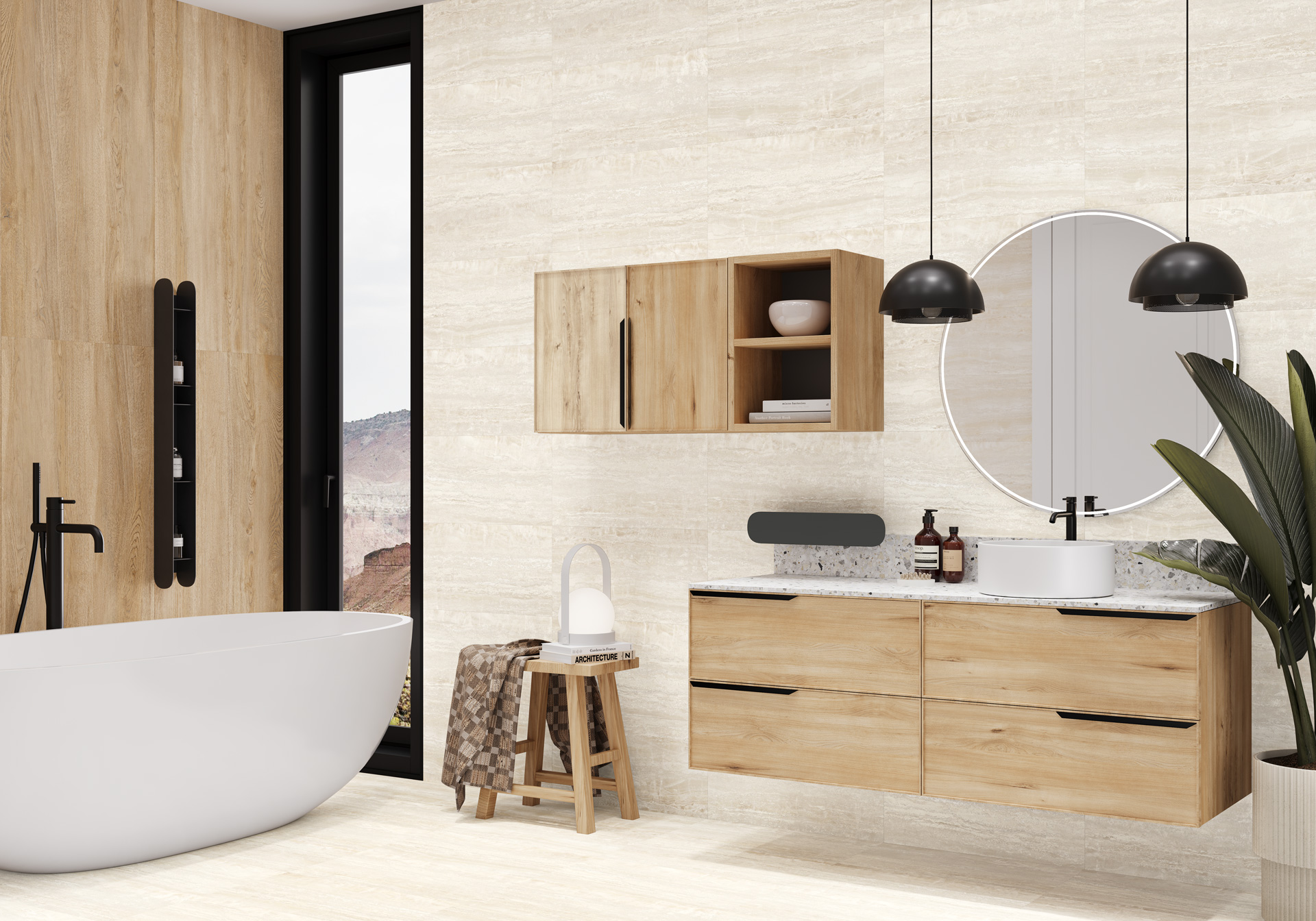 Модная коллекция под травертин в теплых оттенках. Травертин широко применяется в дизайне интерьеров благодаря своей природной красоте и универсальности. Такой вид мрамора прекрасно вписывается в различные стили, от классического до современного, и может стать ключевым элементом дизайна вашего пространства. Не ректифицированные края и матовая поверхность керамогранита подчеркивают натуральность и современность дизайна. Комбинация травертина коллекции Rim и текстурой дерева серии Goa создаст теплый и уютный интерьер с природной эстетикой. Такое сочетание идеально подходит для гостиных или загородных домов, добавляя интерьеру гармонии и тепла. Сочетание травертина и бетона из серии Flagman на разных стенах одного интерьера придаст интерьеру динамики и создаст современный интерьер с контрастом текстур. Это сочетание подойдет для офисов и городских квартир, добавляя интерьеру минимализма и стиля.