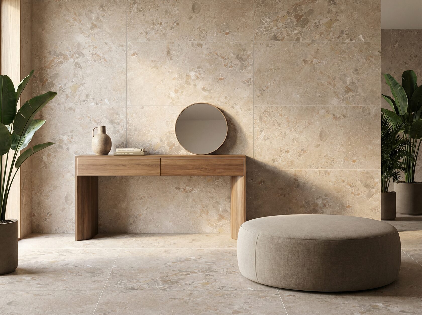 Коллекция "Ручей" Сочетание тёплых тонов и каменной фактуры с коричневыми вкраплениями создает ощущение ручья, текущего среди разноцветных камней.