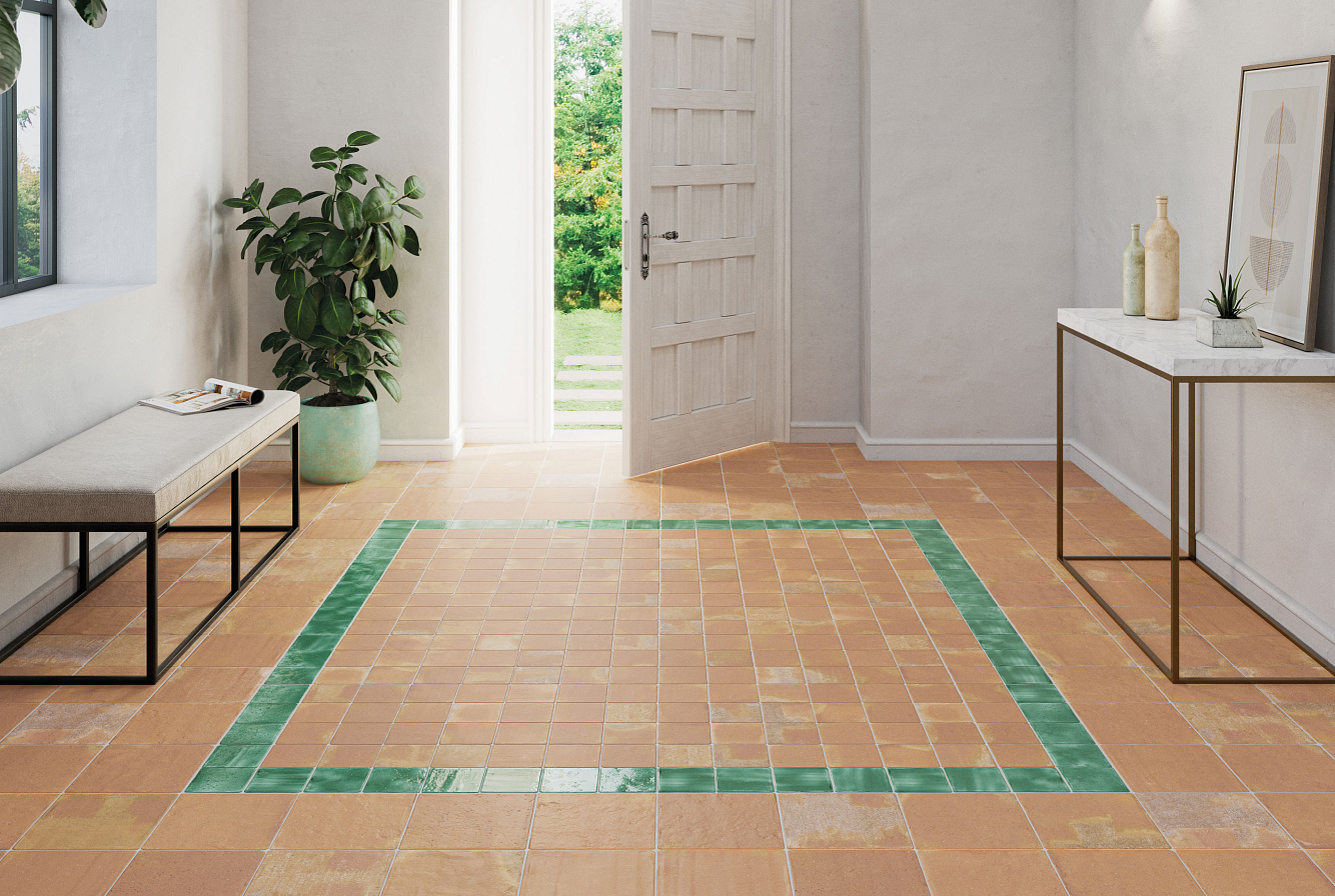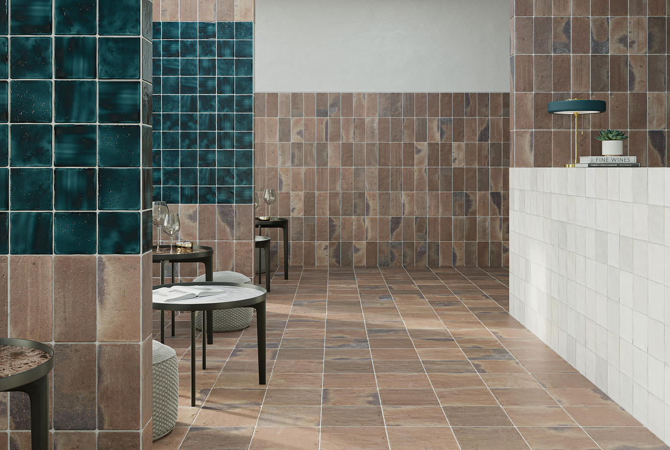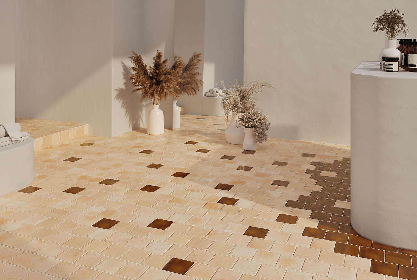 Пять форматов 44x44 см, 22x44 см, 22х22 см, 11х22 см, 11х11 см, три цвета Sand, Cotto, Rust в матовом варианте, и шесть блестящих глазурей: Indigo, Turques, Teal, Honey, White, Olive — все это ROOTS.