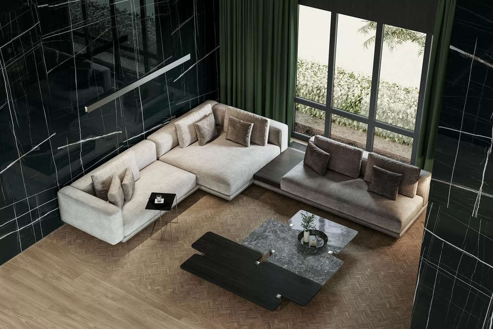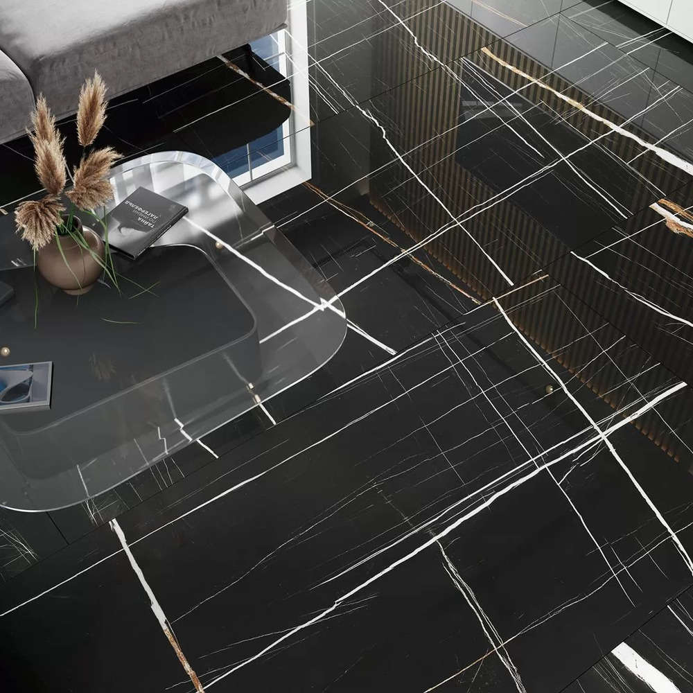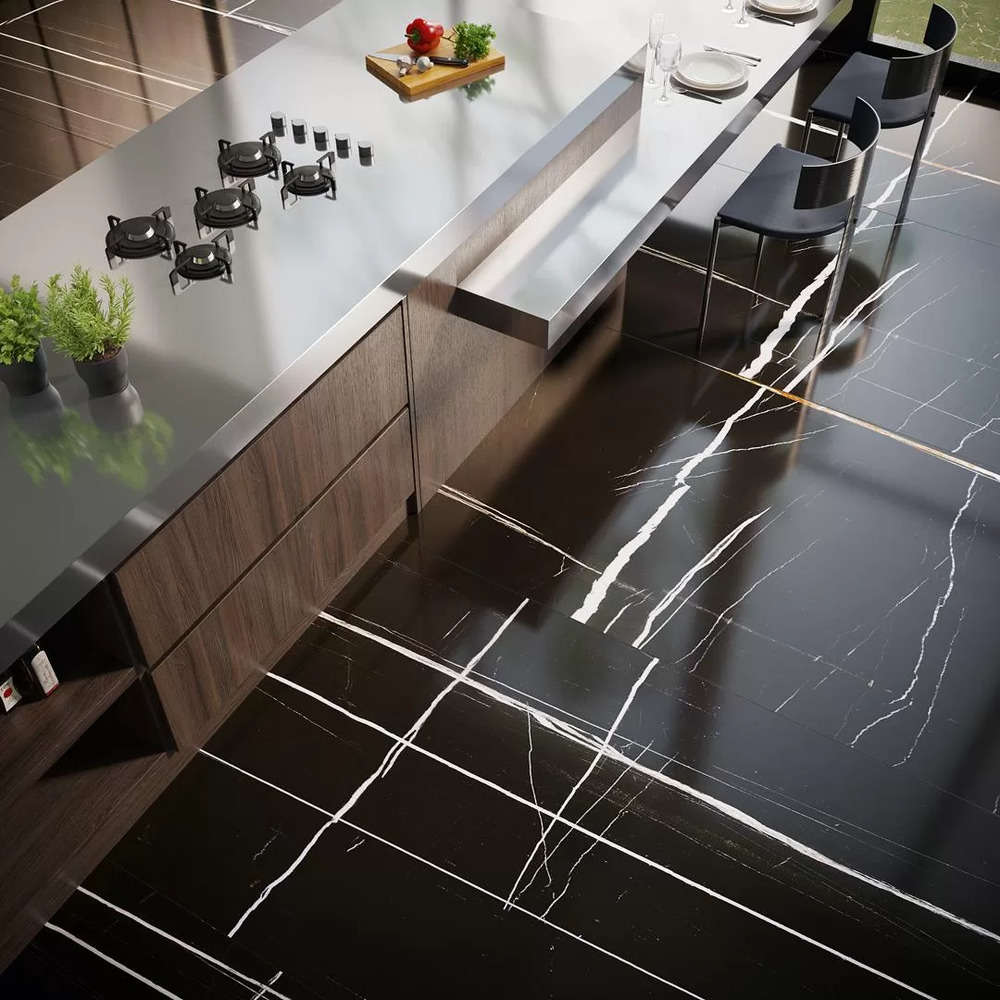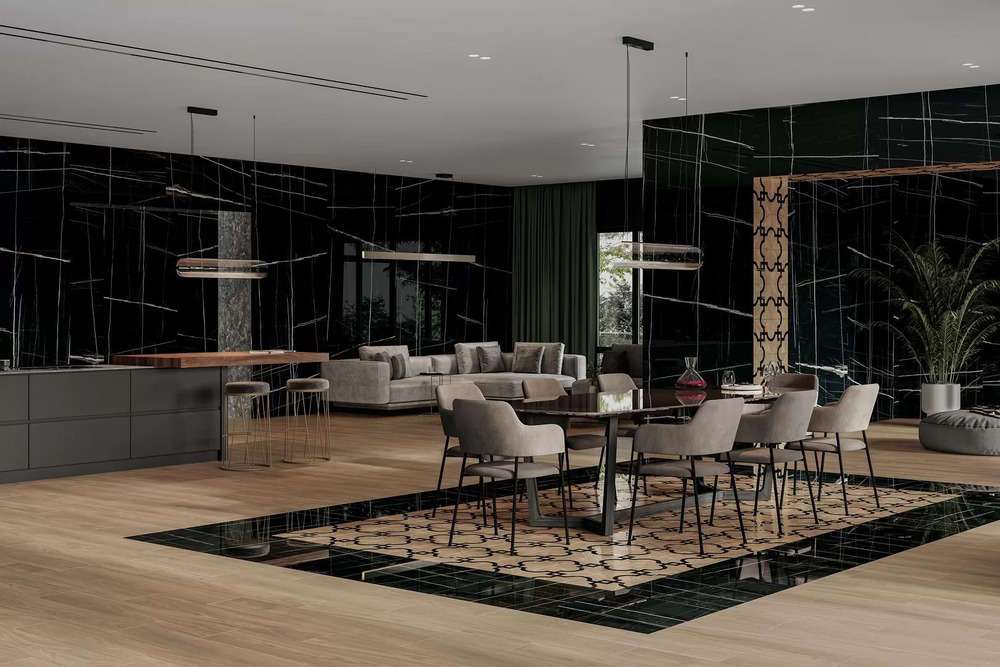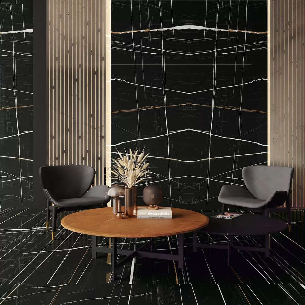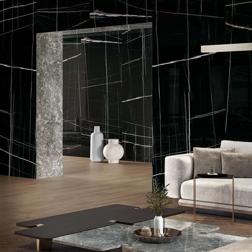 Одним из самых изысканных сортов тёмного мрамора по праву считается «Сахара Нуар». Его чёрная зеркальная поверхность, рассечённая тонкими прожилками, пленяет с первого взгляда. Этот природный рисунок, воплощённый в керамическом граните СУПЕРМАКСИ-формата, идеально подходит для применения как в общественных, так и в частных интерьерах.