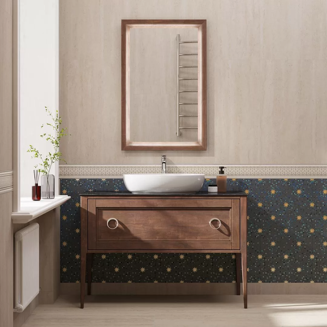 Особого внимания заслуживают декоры — мозаика из искусственно состаренных кирпичиков, собранных на монтажную сетку. Такие крупные элементы с «античным» эффектом в нашем ассортименте представлены впервые.