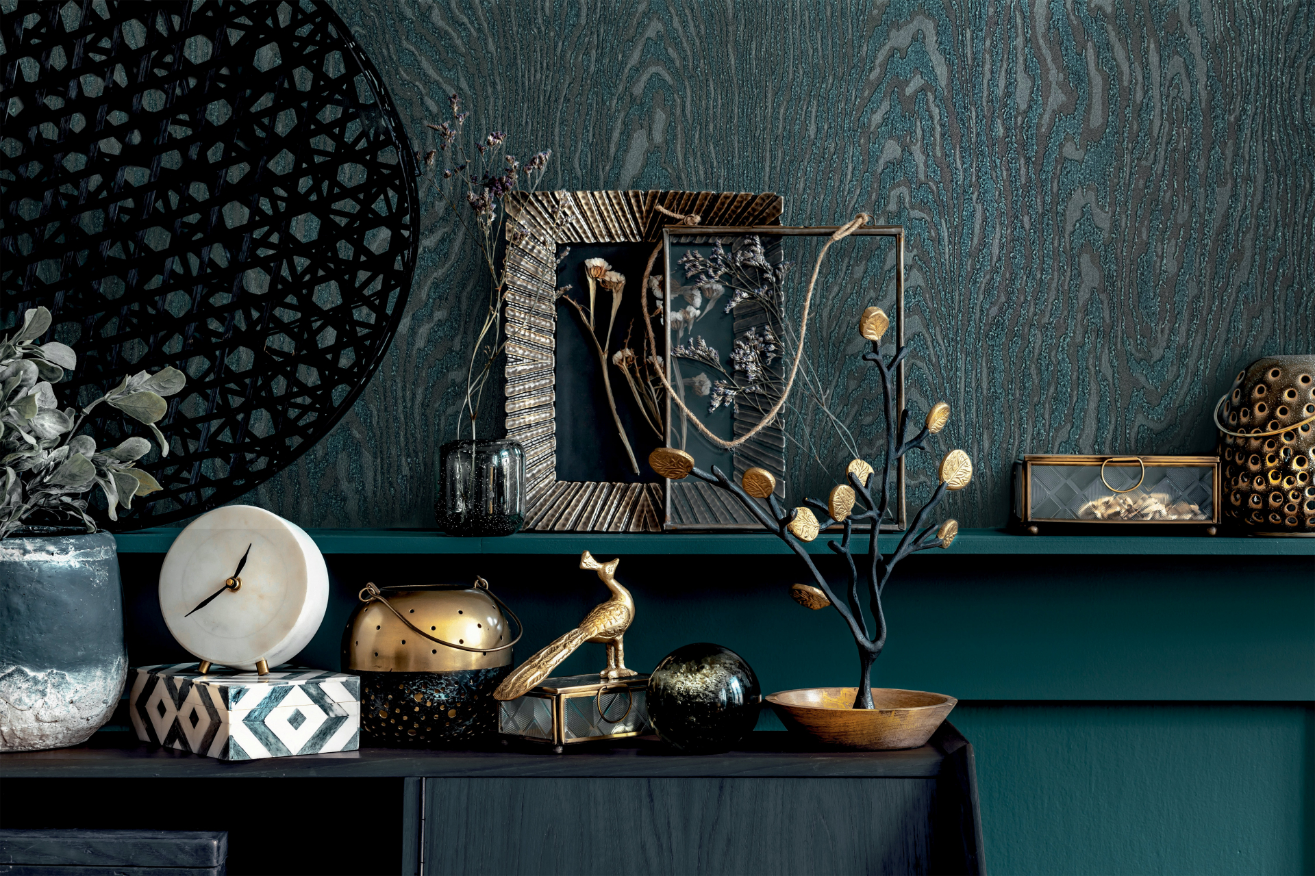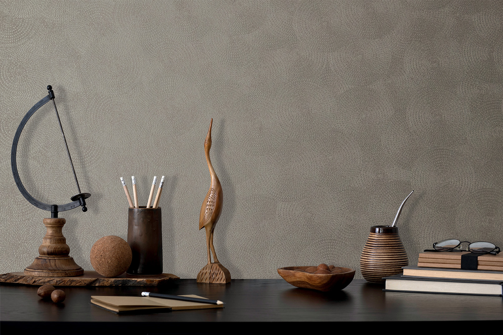 Мотивы, напоминающие древесные прожилки, дополненные сияющей текстурой, привносят в помещение природную красоту и тепло. Они прекрасно сочетаются с деревянной мебелью и натуральными тканями, усиливая природный эффект.