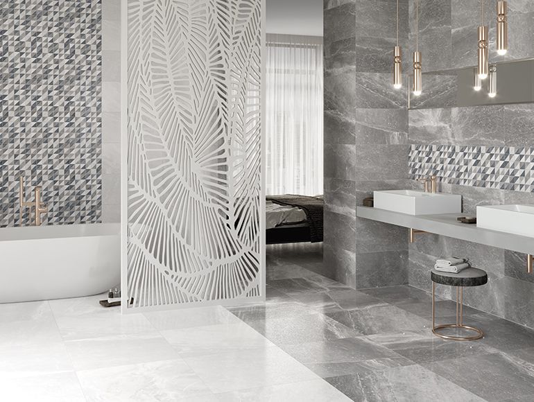 В коллекцию вошла также мозаика 30х30 см с монохромными чипами и в многоцветном исполнении «микс». Ещё одним эффектным элементом коллекции керамогранита Skyline Villeroy & Boch станет мозаика из шестиугольников формата 29х25 см. Так как в ней собраны гексагоны всех трёх расцветок, она идеально подойдёт к любой фоновой плитке. Лаппатированные модули обладают приятным благородным блеском, подчёркивающим красоту каменной текстуры.