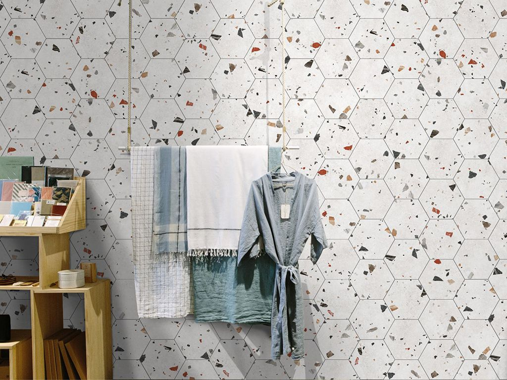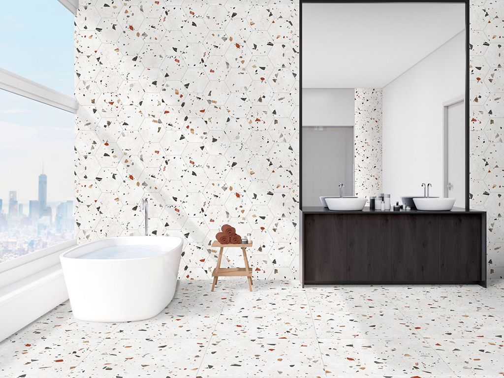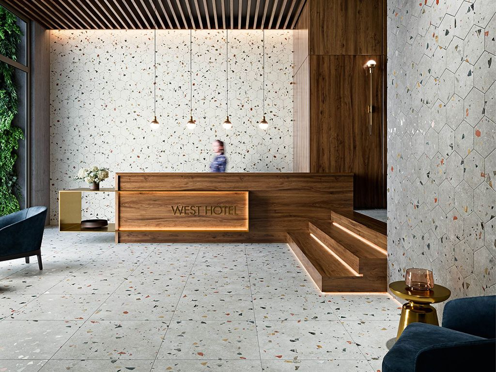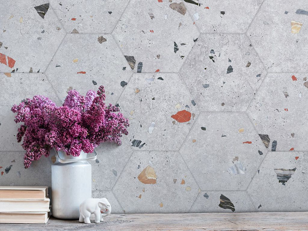 Это успешное и оригинальное дизайнерское исполнение глазурованного керамогранита 66 х 66 см и шестигранников 22 х 25 см на широко растиражированную тему terrazzo, представленную обычно бесконечными более-менее удачными вариациями на тему мелких камушков или абстрактных миксов ярких осколков колорантов.