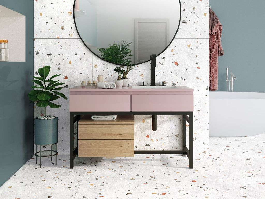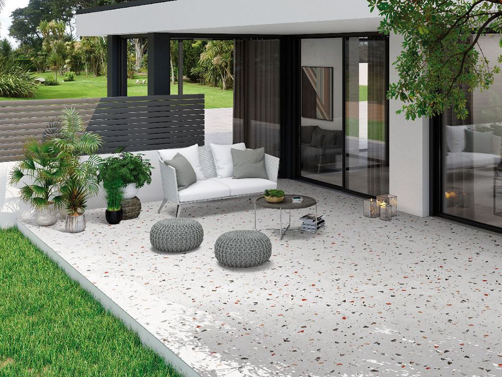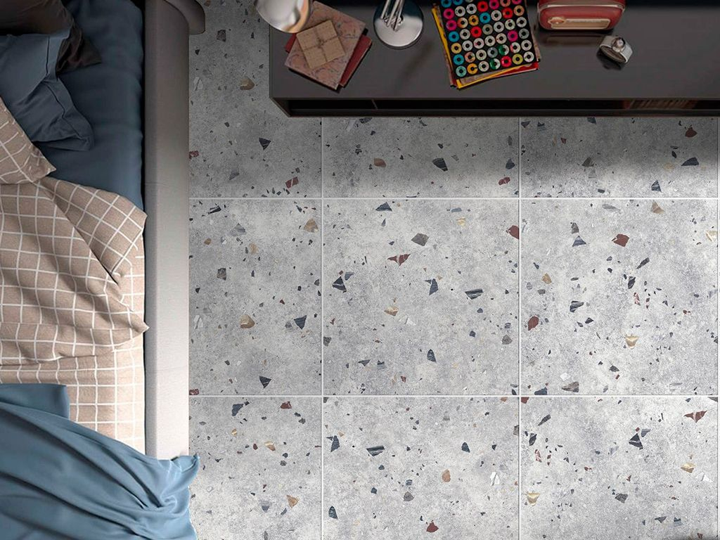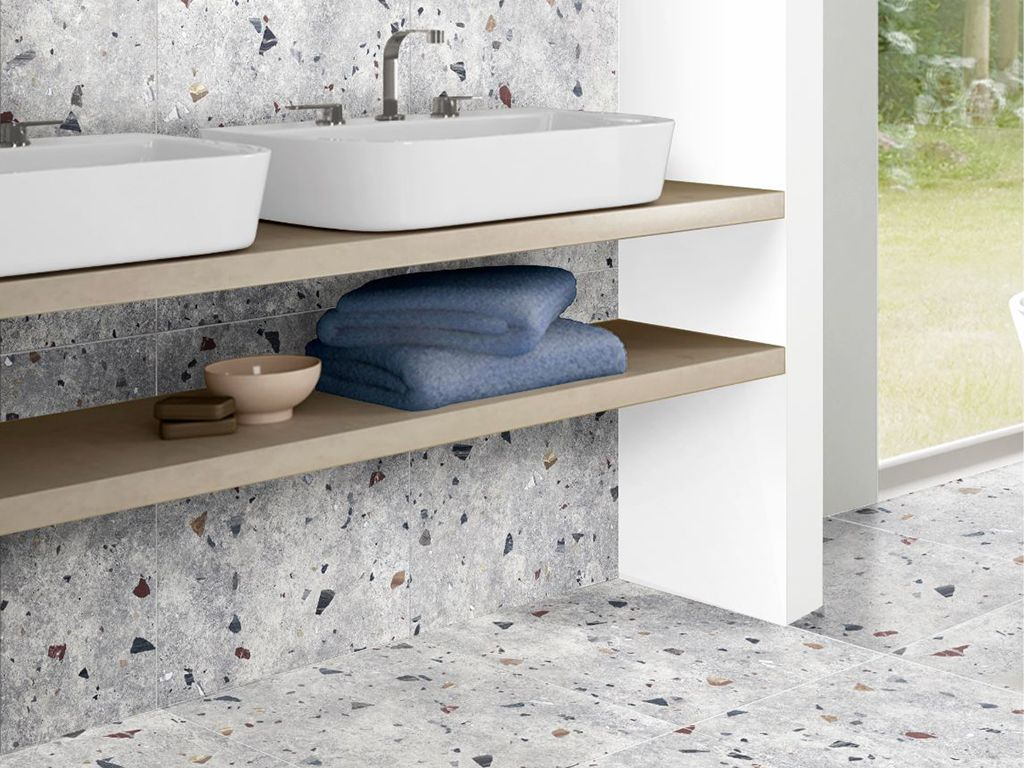 Это успешное и оригинальное дизайнерское исполнение глазурованного керамогранита 66 х 66 см и шестигранников 22 х 25 см на широко растиражированную тему terrazzo, представленную обычно бесконечными более-менее удачными вариациями на тему мелких камушков или абстрактных миксов ярких осколков колорантов.