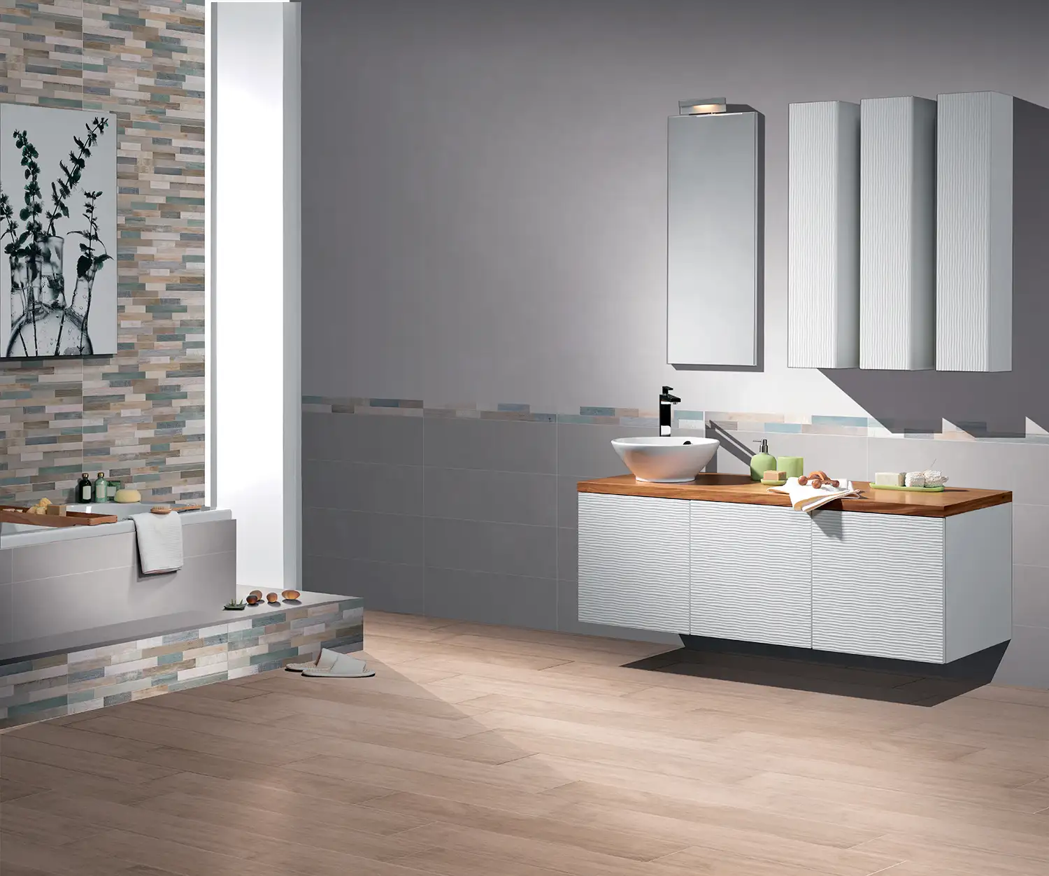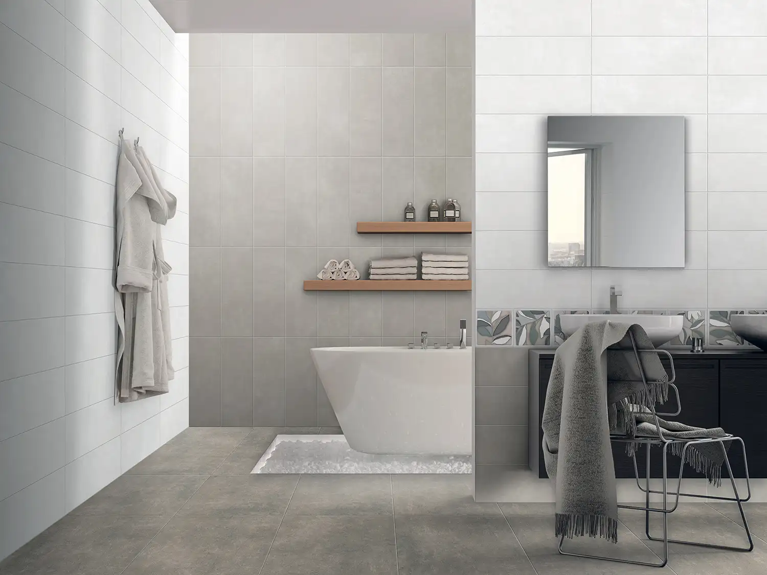 SOUVENIR. Плитка прямоугольной формы. Сочетает в себе элементы современного стиля и прованса. Имеет гладкую матовую поверхность. По своей фактуре схожа с цементом и обоями. Представлена в нейтральных оттенках.