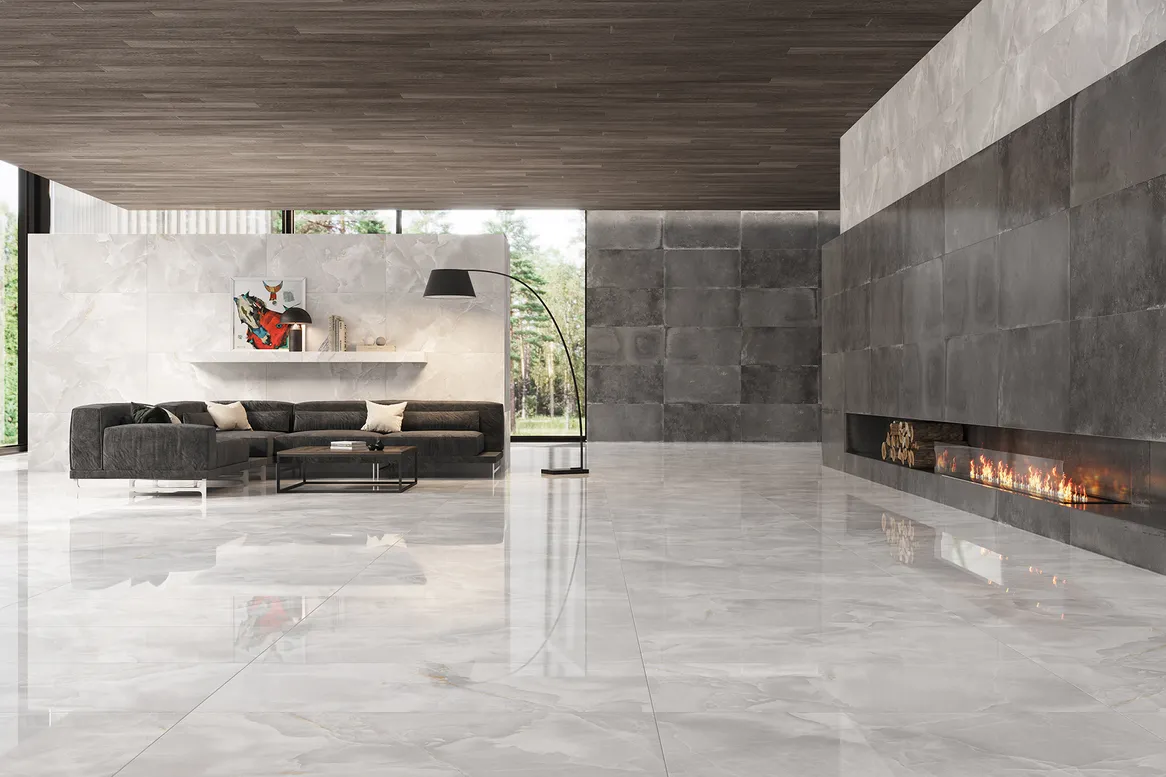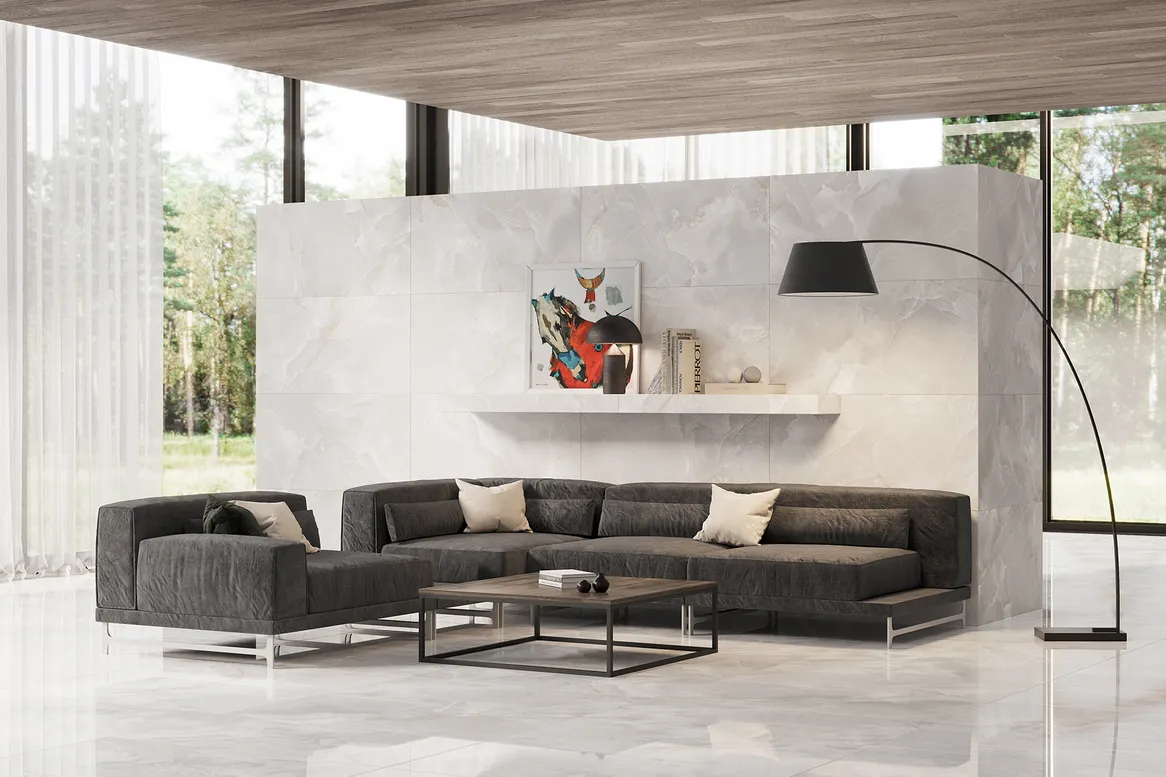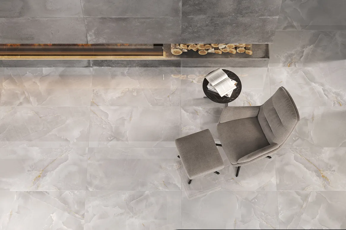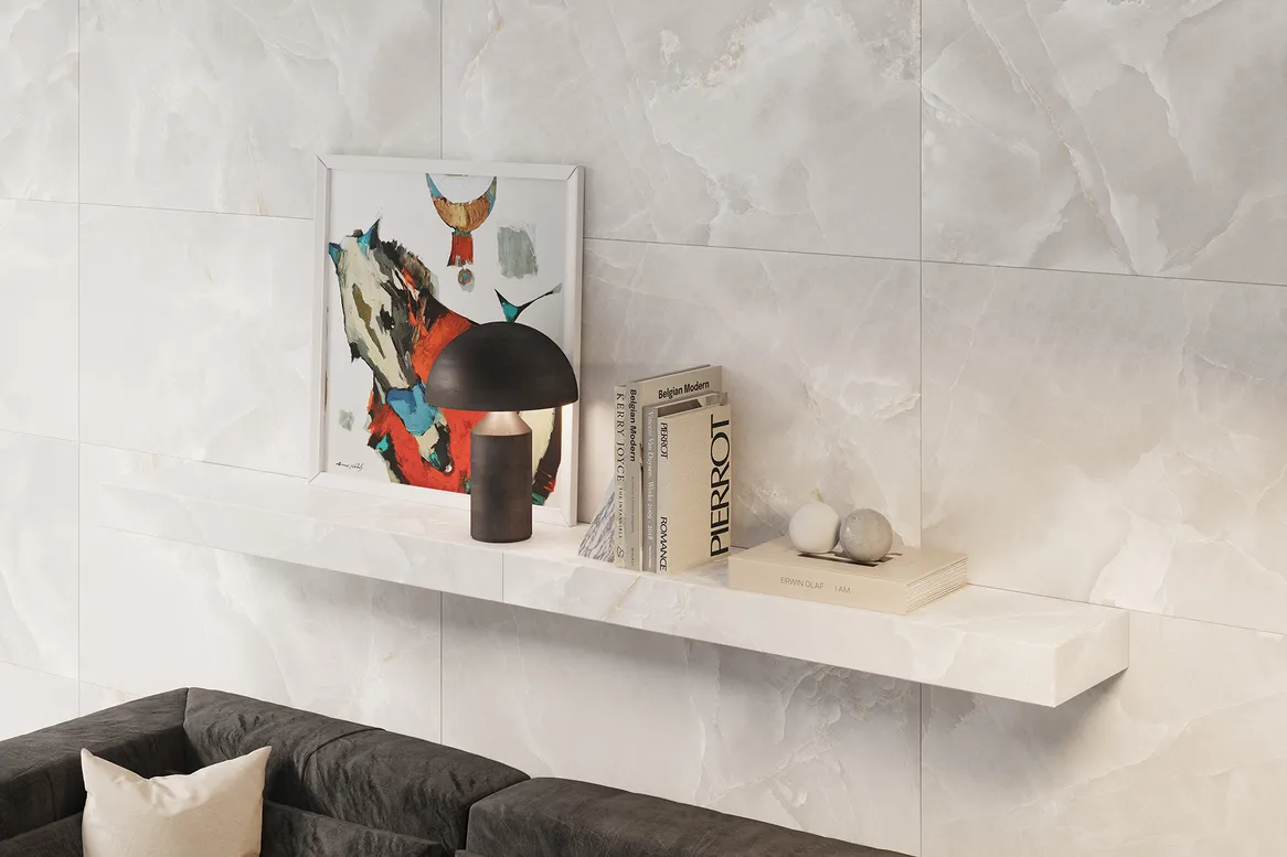 Spirit White - Представляет палитру нежных оттенков от кремово-белого до медово-желтого, воплощающую в себе изысканность натурального оникса. Его ненавязчивые прожилки золотистых оттенков прокладывают себе путь через жемчужный фон, создавая элегантную композицию, делая этот керамогранит эксклюзивным выбором для тех, кто ищет минималистский шарм и утонченную атмосферу.