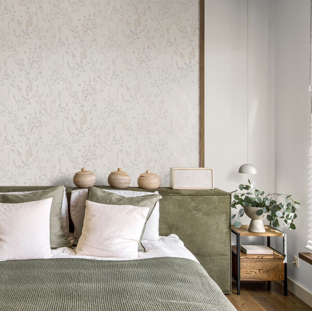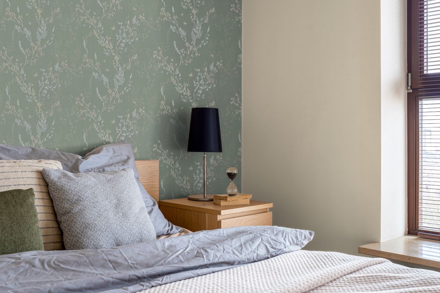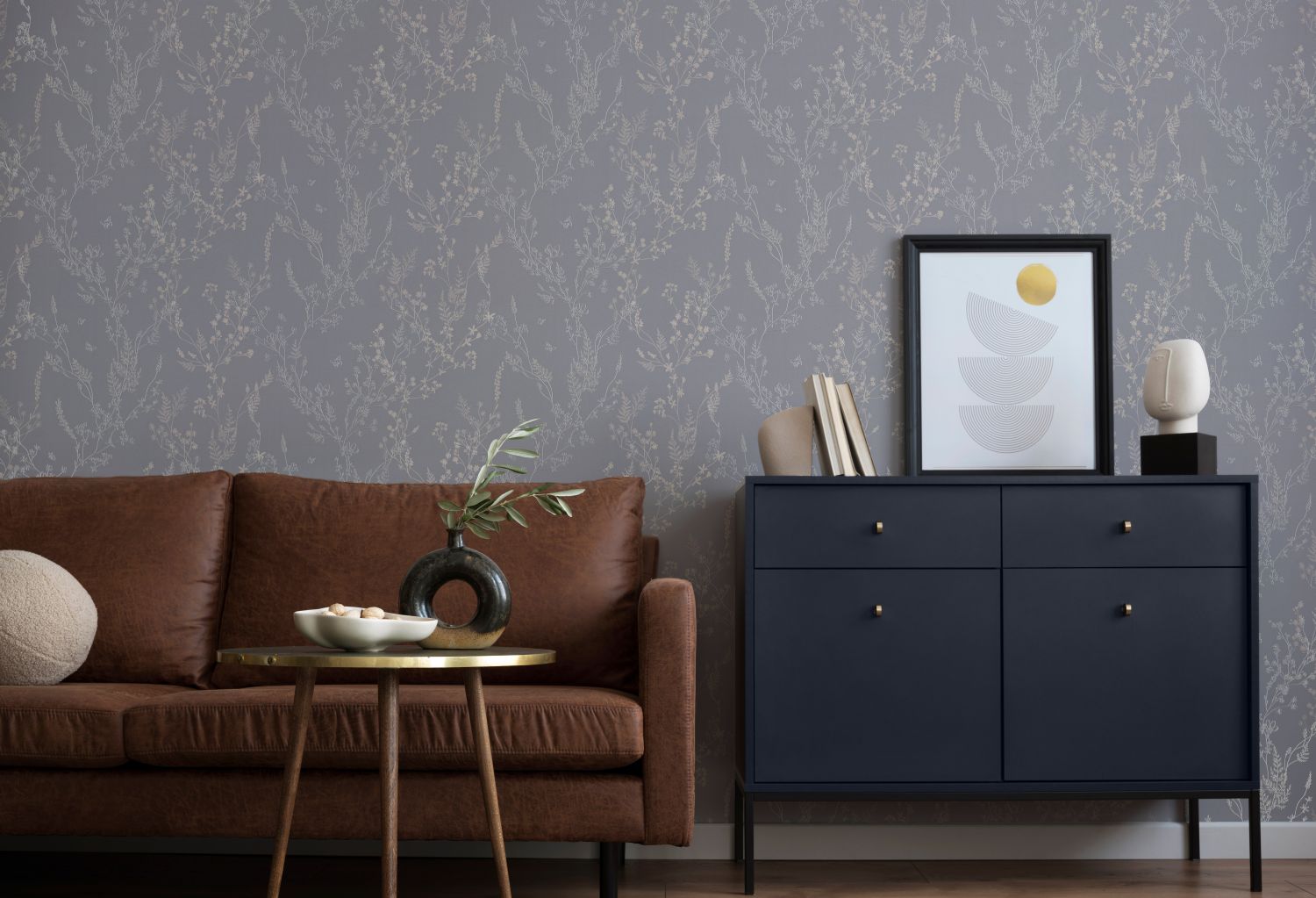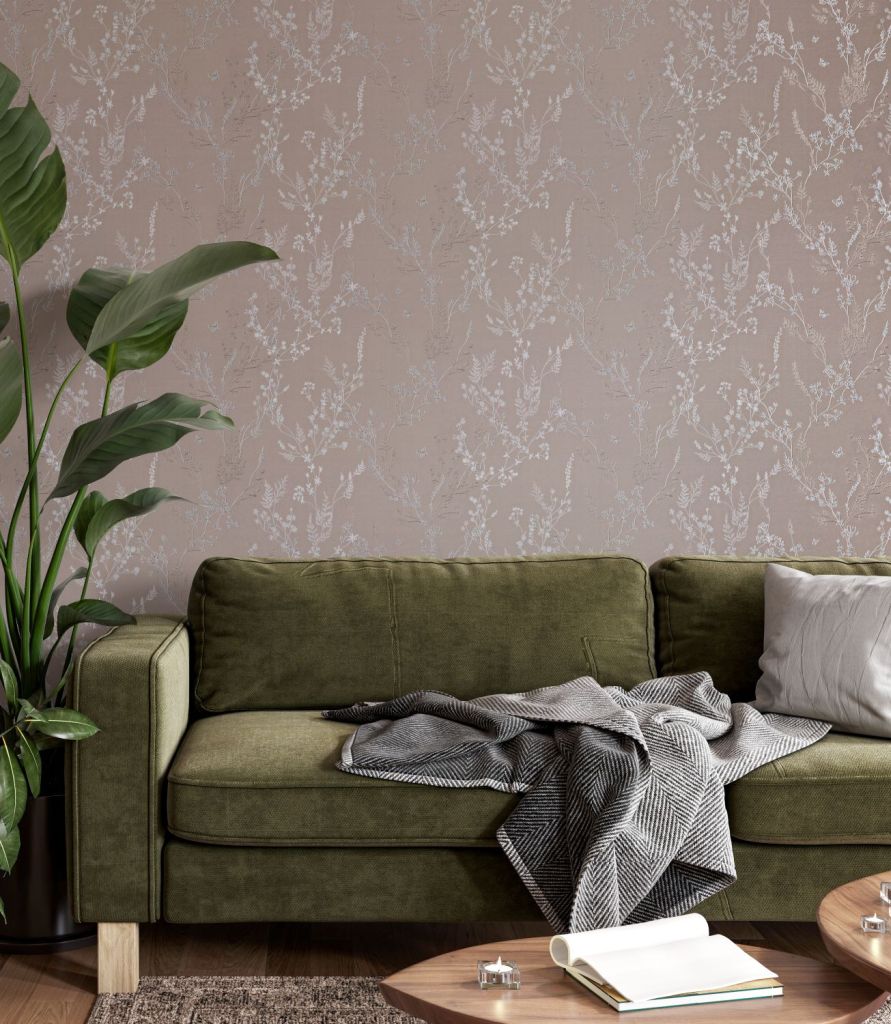 Игра рельефа на свету создает зеркальный эффект на основном мотиве. Благодаря разноуровневому тиснению дублирующие силуэты травинок и цветов, словно тень, уходят на задний план, визуально расширяя пространство.
