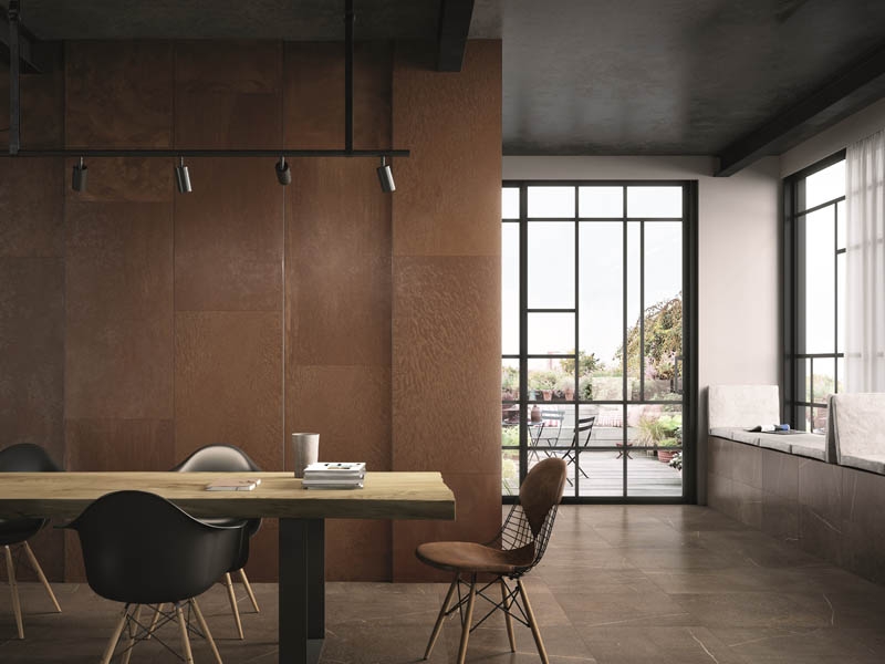 Керамогранит серии износостоек, прочен и не реагирует на резкие температурные скачки. Доступно для покупки два варианта цвета изделия – Кортен и Стил. Темно-серый и темно-коричневый оттенки помогают акцентировать внимание на покрытии в гостиной, ванной комнате, столовой или же в современно оформленной кухне. Плитка Италон отлично смотрится не только на полу или стенах, но и на лестнице.