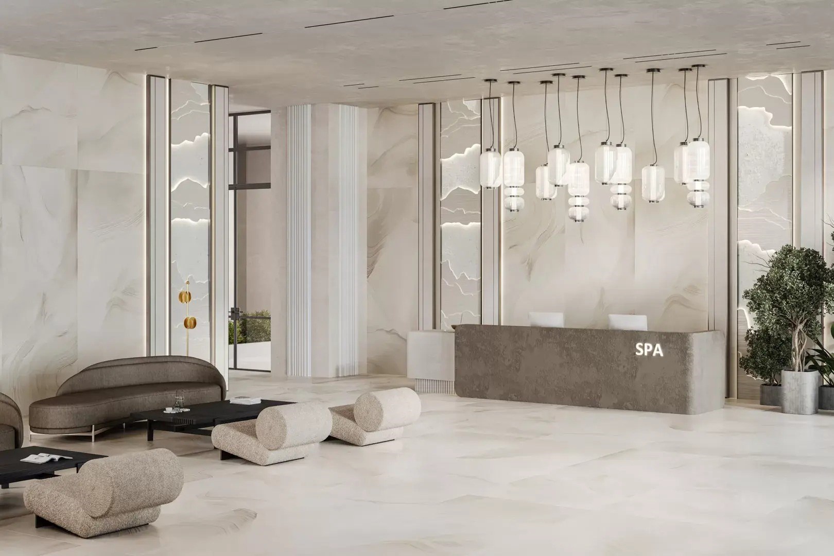 Керамический гранит «Дюна». Эти панели формата СУПЕРМАКСИ имеют текстуру, напоминающую песчаную поверхность с оригинальным узором, созданным ветром. В структуре видна естественная красота, которую можно использовать в проекте в размере 119,5×320 при толщине 6 или 11 мм. Керамогранит песочного цвета объединяет природную эстетику и необычную текстуру, которая выглядит современной.
