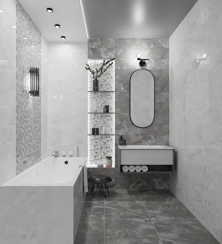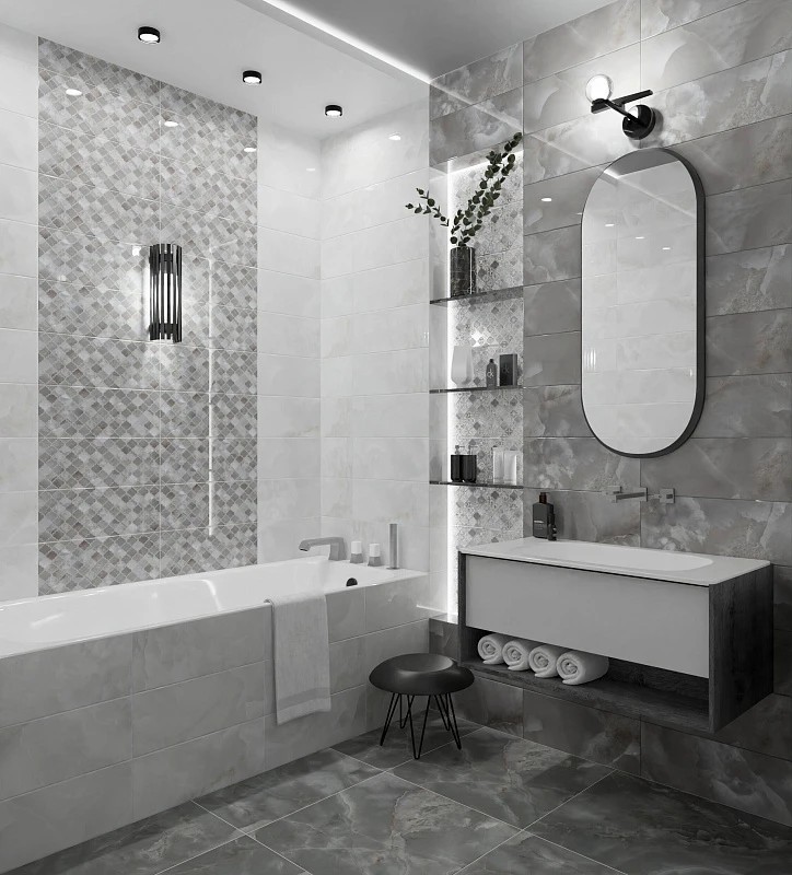 Декоративная база Талисман Орнамент/Talisman Ornament представляет ритмичную решётку марокканских форм с чередованием более насыщенных и более спокойных ониксовых полей, создавая аккуратный графический рисунок для выделения ниш и акцентов. Единство формата упрощает компоновку; коллекция идеальна для ванных, кухонь и общественных пространств, где ценят свет, глянец и современную элегантность.