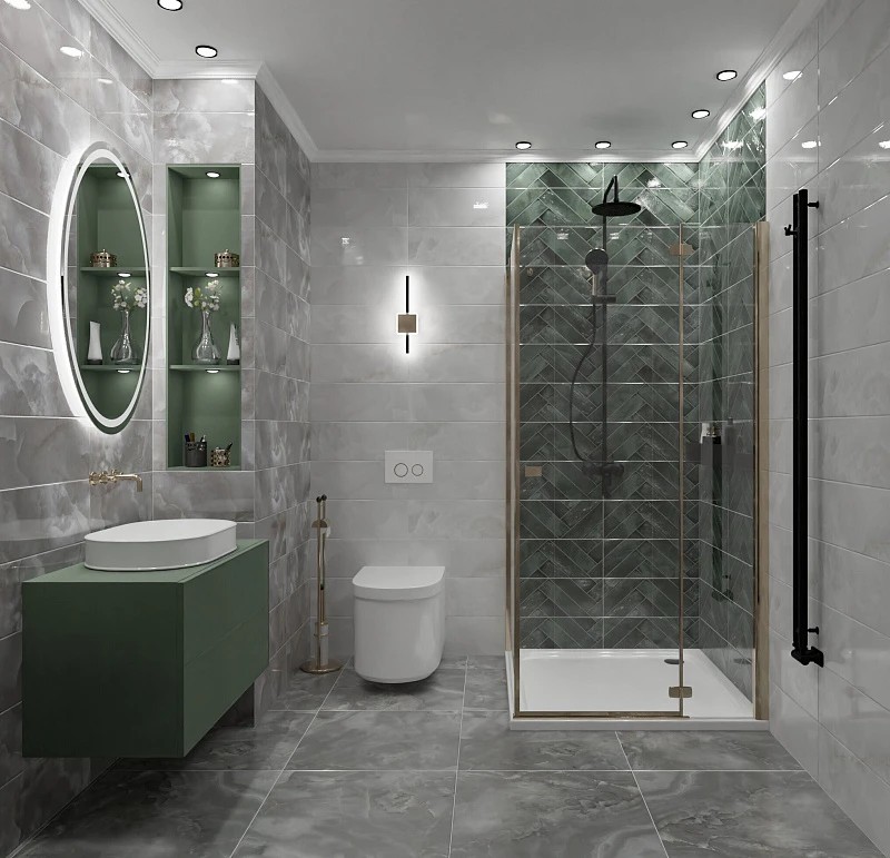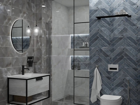 Коллекция Талисман/Talisman — глянцевый оникс: поверхность подчёркивает глубину каменного рисунка и усиливает визуальную насыщенность. Базовая плитка с текстурой оникса представлена в нейтральной палитре серых и холодно‑стальных тонов с аккуратными бежевыми прожилками, мягко оттеняющими рисунок. Талисман Кирпичи/Talisman Bricks в зелёных и синих вариантах задают выразительный «кирпичный» ритм укладки. Декор Талисман/Talisman выполнен с применением декоративного стеклянного покрытия, мерцающего блеска, мастики и металлика — тонкие переливы создают благородные бликовые акценты.