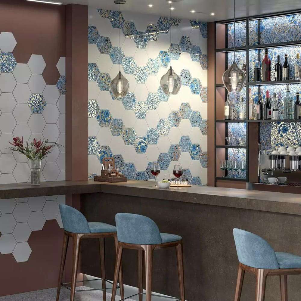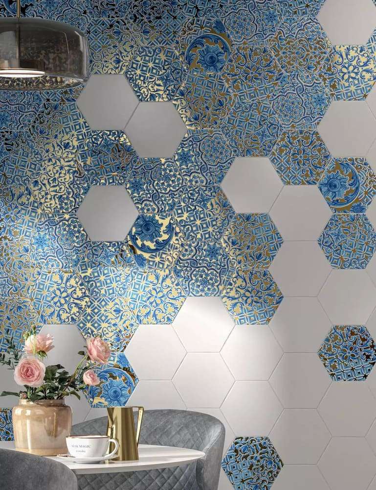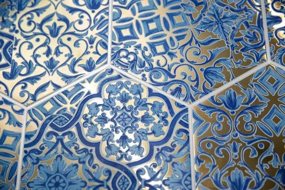 Коллекция керамической плитки «Талья» от фабрики KERAMA MARAZZI станет интересным и ярким решением в интерьере любой комнаты, способным сделать атмосферу уютной, создать настроение всей семье. В данной коллекции представлено шесть образцов декоративной плитки, оформленных в традиционной технике португальского искусства. Настенные декоры выполнены в форме шестиугольника форматом 20×23 см. Плитки с глянцевым золотым фоном украшены изумительно красивым ярко-голубым орнаментом. Оригинально оформленная керамика идеально подойдёт для создания ярких интерьерных акцентов, особенно в сочетании с белой фоновой плиткой из коллекции «Буранелли». Подчеркнуть изысканность отделки помогут «золотые» бордюры 20х2 см и «бисер» 20х0,6 см голубого, синего или золотистого цвета. Коллекция декоров «Талья» удачно впишется в интерьеры частных домов и квартир, а также в интерьеры общественных мест – баров, студий, отелей, кафе и др. Облицованная поверхность длительное время не утратит свой презентабельный внешний вид, так как обладает высокой степенью прочности, защитой от воздействия влаги и химических веществ.
