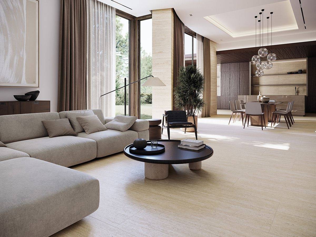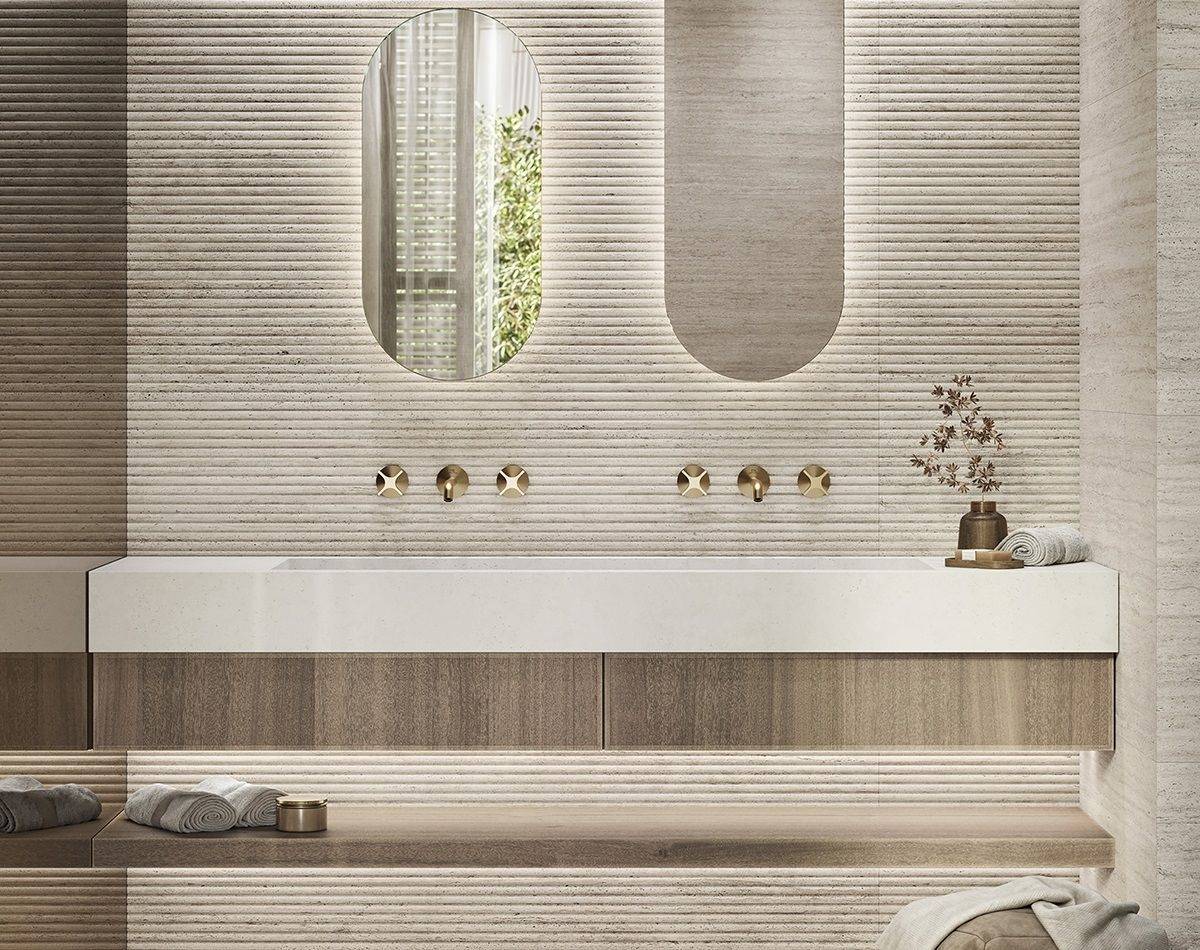 Элегантная фактура травертина предложена в коллекции Porcelanosa Taranto, включающей настенную керамическую плитку и универсальный керамогранит. Дополняют базовую плитку изящные настенные декоры с объемной поверхностью. Плитка и керамогранит исполнены в двух тёплых оттенках, характерных природному травертину, которые идеально впишутся в концепт современных интерьеров.