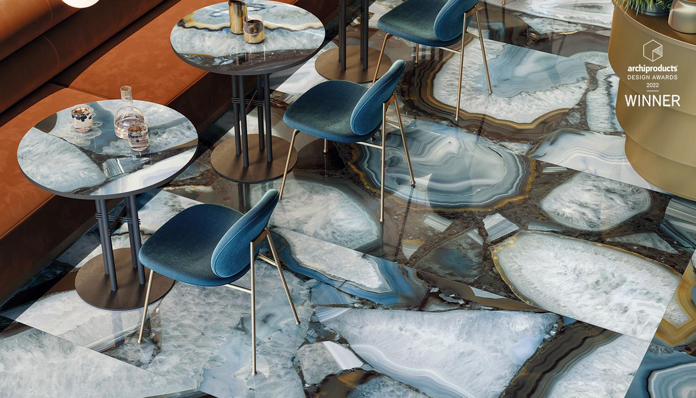 Гигантские пропорции, которые Emilceramica выбрала для переосмысления кварца, создают поразительный эффект для агата в трёх цветовых вариантах. Характерные для агата круглые формы разбиваются на фоне эффектов светотени, доведённых до предела, с едва заметными более тёплыми или более холодными цветами, создавая сложный графический узор, который перекликается с однотонными плитками за счёт размытого цветового соответствия и общей кристаллической структуры. Кварц, увеличенный в размерах и эстетичный, доминирует в дизайне жилых помещений благодаря своим массивным плитам, которые становятся ещё более изысканными благодаря глянцевой зеркальной поверхности керамики.