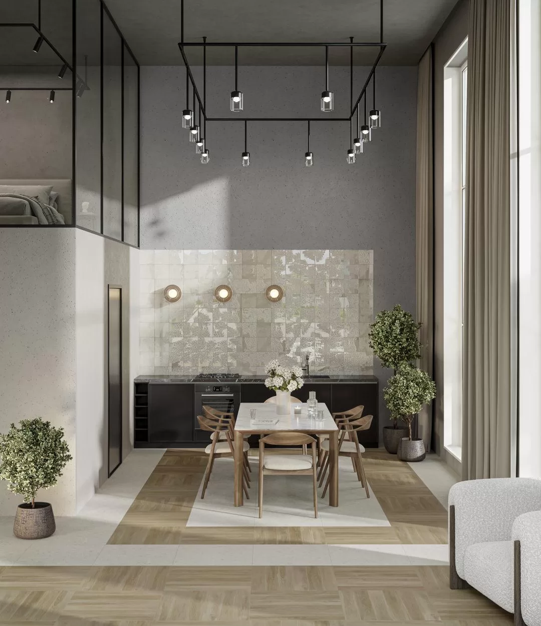 Данный формат керамического дерева соответствует максимальному размеру плашек классического деревянного паркета — 9,6×60 см. Такой формат значительно упрощает работу и позволяет укладывать плитку ёлочкой быстро и аккуратно не только в домашних интерьерах, но и на больших площадях общественных пространств.