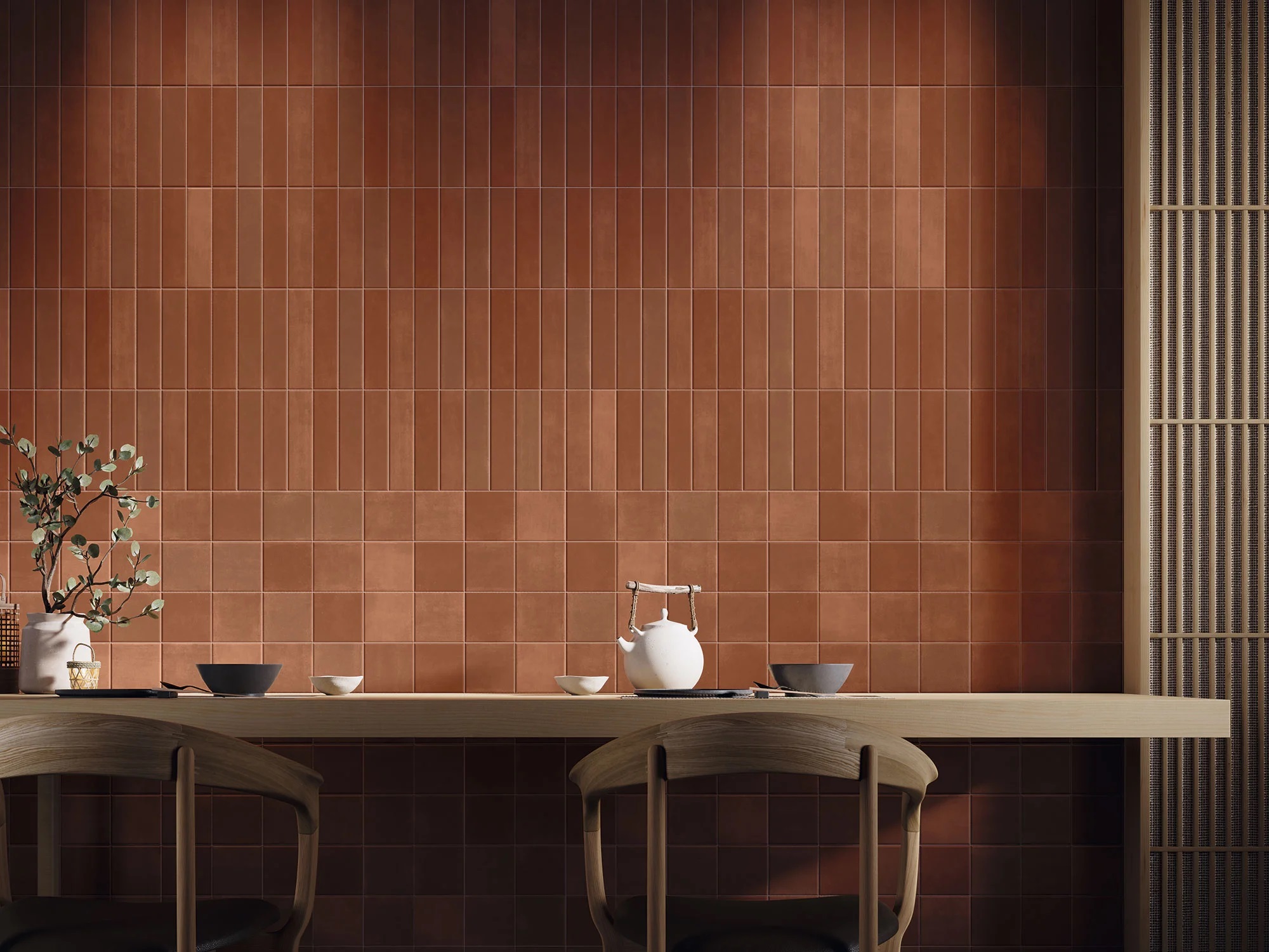 Одним из ключевых трендов выставок керамики последних лет, стало оформление терракотовой основы цветными декоративными элементами. Такой прием придает интерьеру динамику и индивидуальность и создает интересный контраст фактур.