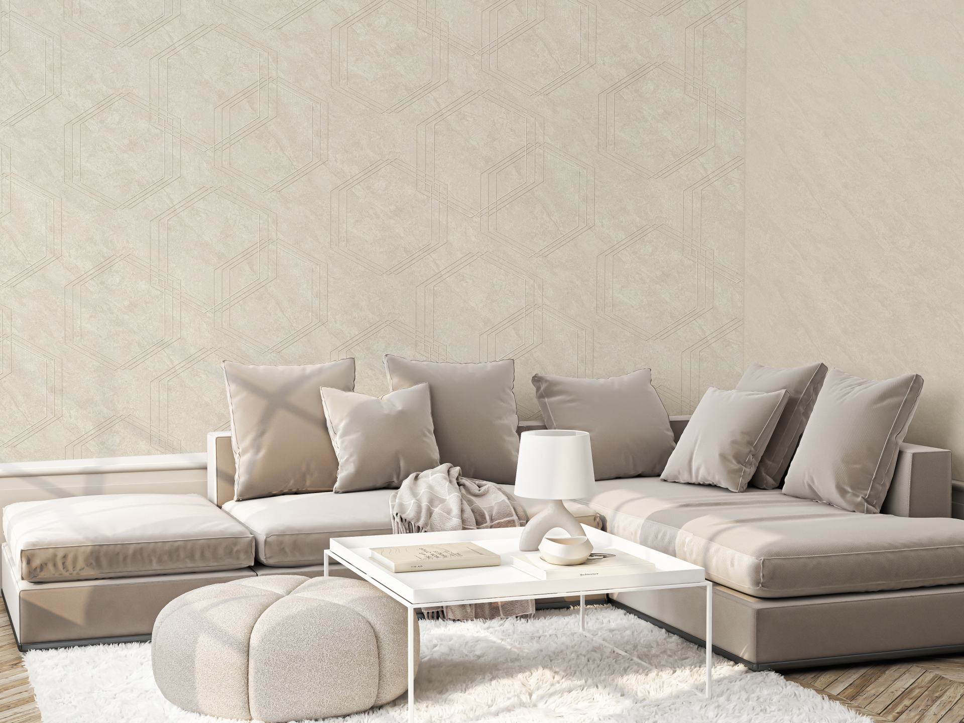 Фон новой коллекции «Торонто», напоминающий гранит, подчёркивает строгую чёткость гексагонов – они проступают острыми гранями за счёт тиснения или растворяются в фактуре гранита. Такой приём создаёт лёгкий 3D-эффект без намёка на визуальную перегруженность.