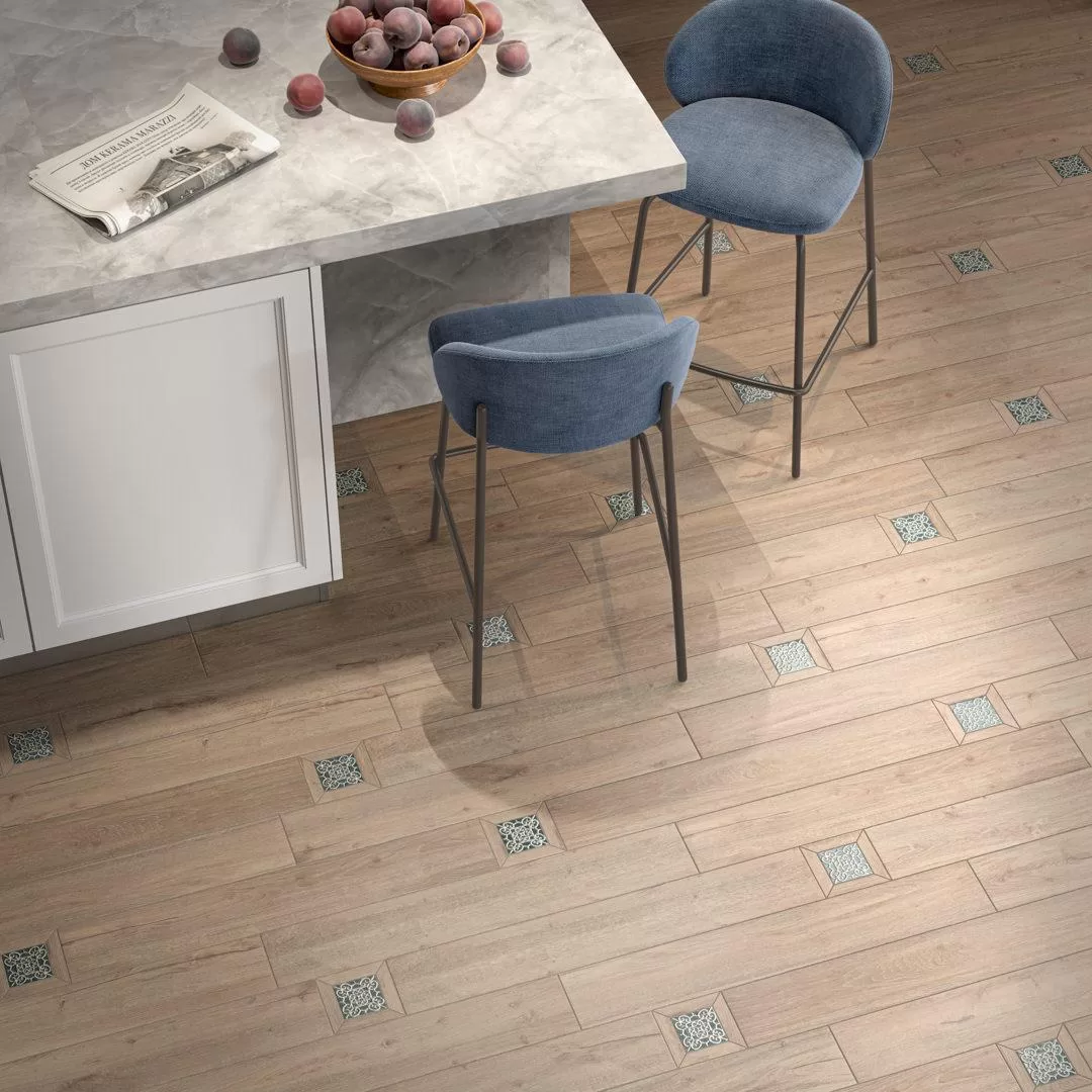 Такая керамическая доска подходит для использования в абсолютно любых интерьерах: частных и общественных, городских и загородных. Формат подходит для всех видов традиционной укладки, в том числе палубной и со смещением. Можно уложить керамогранит ёлочкой, дополнив раскладку фигурным керамическим плинтусом с внутренними и внешними углами, выполненными в тон с настенной плиткой. Творческий потенциал серии расширяют яркие наборные вставки, собранные для удобства укладки на монтажную сетку. На них матовое дерево эффектно контрастирует с глянцевым блеском майолики цвета морской волны. Специальный декорирующий состав создаёт эффект неоднородности цвета, словно на играют солнечные блики.