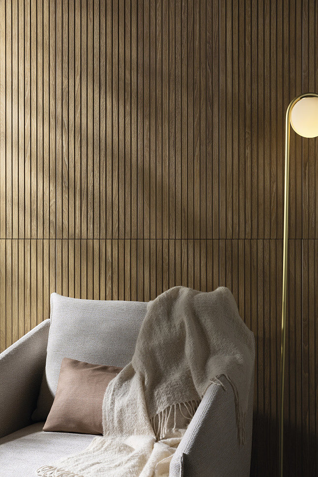 Peronda предлагает коллекцию настенной плитки Verbier Wall, которую можно сочетать с коллекцией плитки для напольных покрытий Verbier. Рельеф, воспроизводящий тонкие дубовые пластины, создает визуальный эффект зигзага с определенной точки обзора, отбрасывая небольшие тени, которые придают плитке ритм и глубину. Изделия формата 33x100 позволяют составлять теплые, сбалансированные и комплексные композиции.