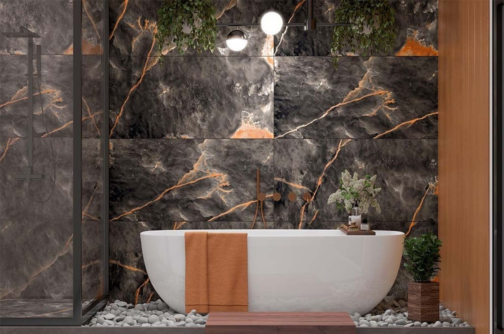 Черный оникс с оранжево-медными прожилками, напоминающий грозовое небо. Это акцентная и выразительная коллекция, которая станет центром интерьера.